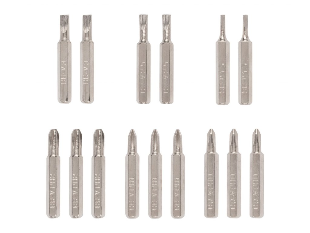 - 15x 28 mm bity (3ks PH0, 3ks PH1, 3ks PH2, 2ks SL1,5, 2ks SL2,5, 2ks SL3,0)