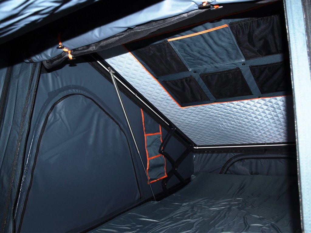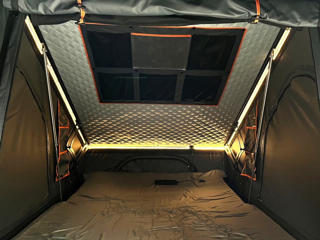 Celohliníkový zvednutý trojúhelník RTT • Vodní sloupec: PU 3000 mm • Počet osob: 2-3 • Rychlá montáž • Výbava: pěnová matrace, antikondenzační podložka, izolační vrstva, moskytiéry • Integrovaný elektrický rozvod (Big Anderson, USB-A, USB-C, cigaretová zásuvka) • LED světlo (LED pásek) • Hmotnost: 85kg • Rozměry v rozloženém stavu: 210 × 144,5 × 150 cm