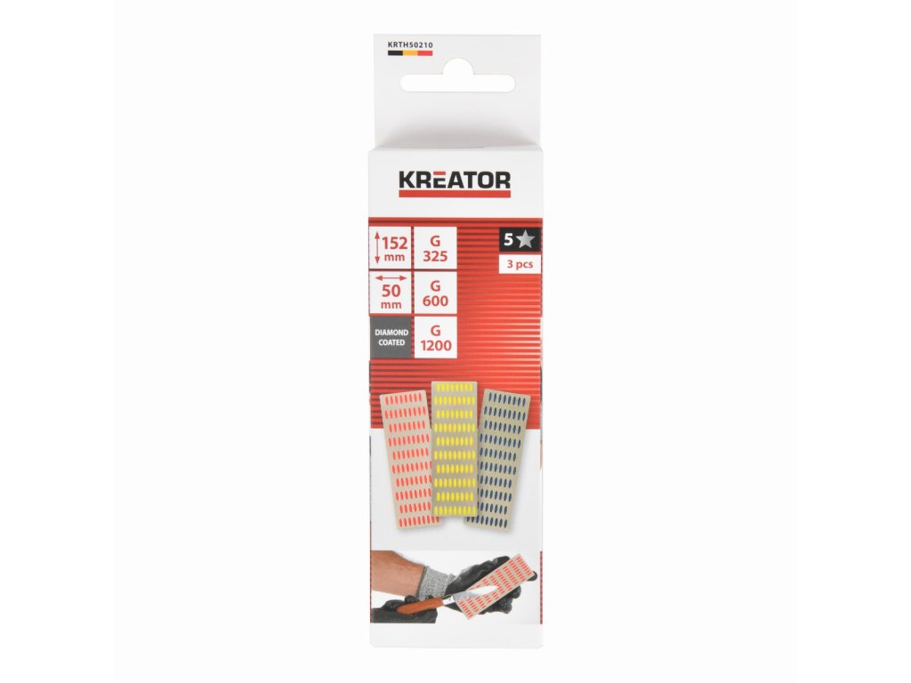 Brusný kámen 3ks G325, G600, G1200. Nabrousíte si nůžky, dláta, škrabky a pilové listy s touto praktickou sadou KRTH50210 z naší řady Kreator. Tři diamantové brusné desky měří 152 x 50 mm a každý má jinou zrnitost: G 325, G 600 a G 1 200., Rozměr - 152 x 50 mm, Zrnitost - G 325, G 600, G 1200,...