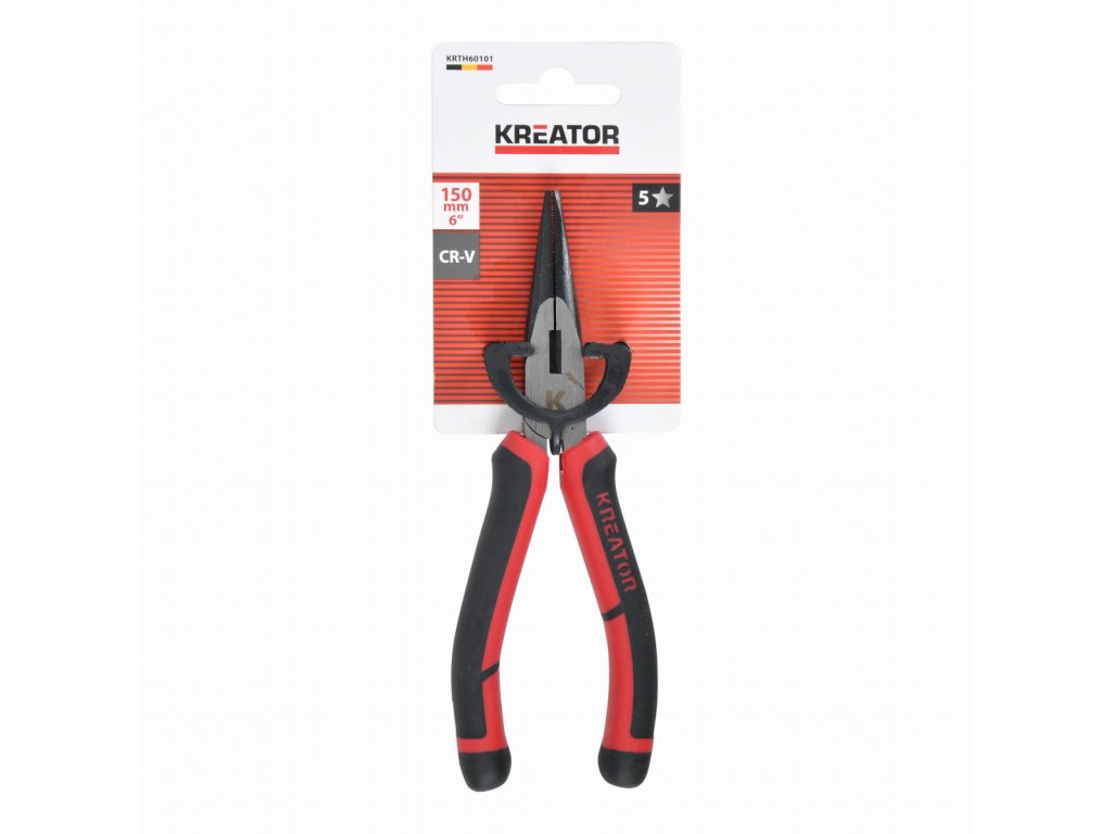 Dlouhé kleště ploché 150mm HIGH QUALITY. Tyto vysoce kvalitní kleště KRTH60101 od Kreator s dlouhými plochými čelistmi lze použít k držení, stříhání, odizolování a krimpování vodičů o průměru až 35 mm. Jsou vyrobeny z materiálu CR-V s povrchovou úpravou satin a mají délku 150 mm. Měkké gumové...