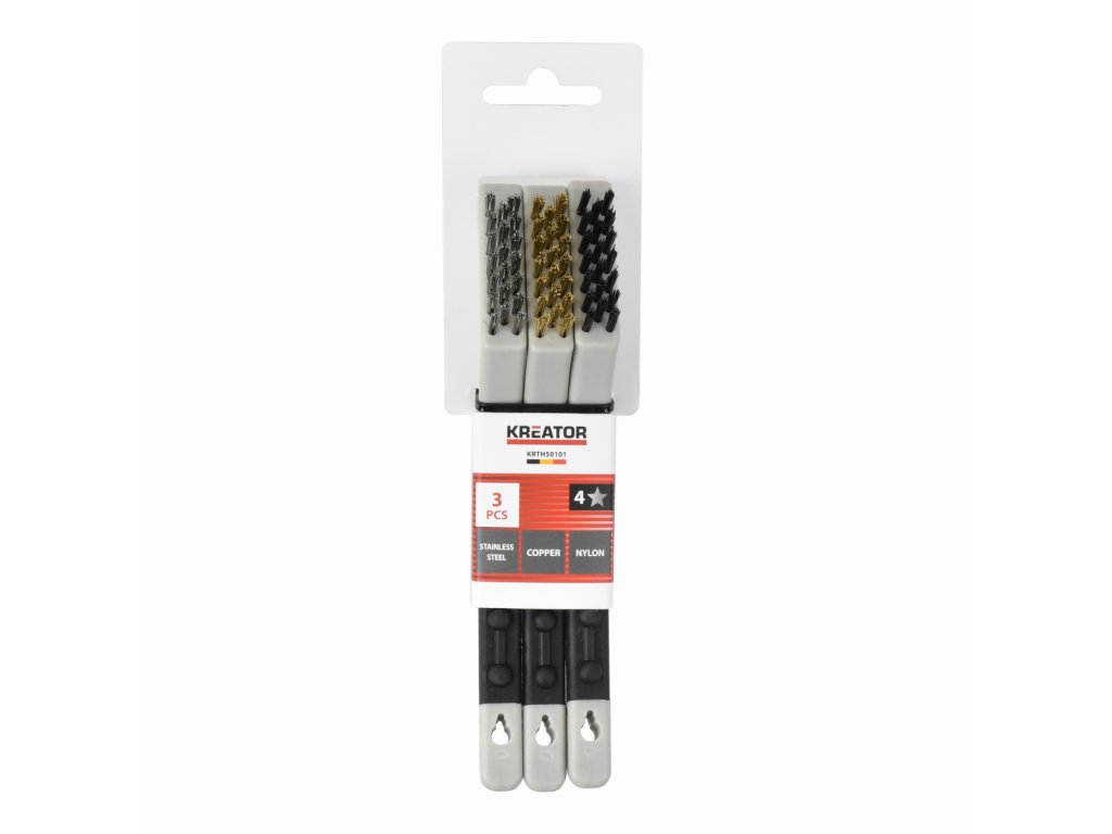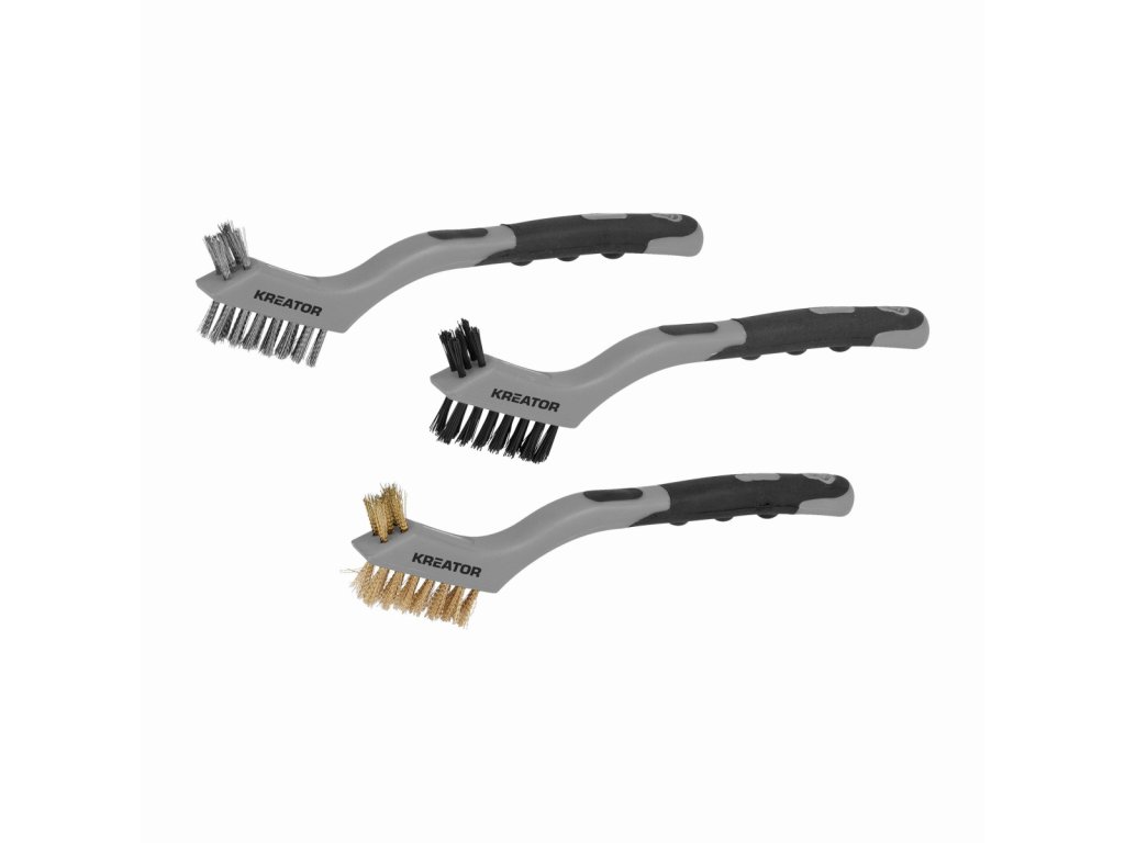 Tato sada KRTH50101 z naší řady Kreator obsahuje 3 drátěné kartáče s různými typy štětin: nerezové, měděné a nylonové. Jsou vhodné pro různé úkoly, jako je odstraňování rzi a nečistot nebo čištění a údržba nástrojů. Tvarovaná plastová měkčená rukojeť zajišťuje pevný úchop.