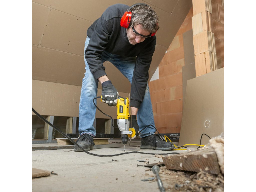 Používejte tuto příklepovou vrtačku s výkonem 1200 W k vrtání otvorů do tvrdých materiálů, jako je dřevo, ocel a beton. Můžete ji použít k vrtání a vrtání s příklepem. Dokáže vrtat až 13 mm do oceli, 20 mm do betonu a až 45 mm do dřeva.