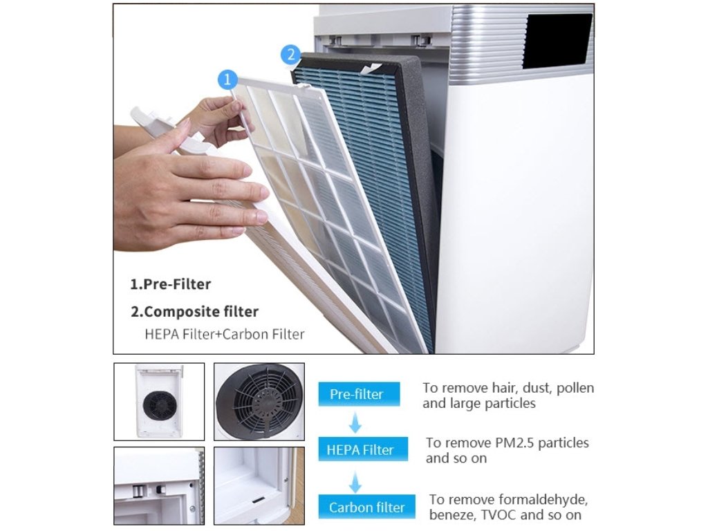 Předfiltr – Základní filtr: Znečištěný vzduch musí projít předfiltrem, kde zachytí všechny velké částice, jako jsou chlupy domácích mazlíčků, plísně a prachové částice, atd.