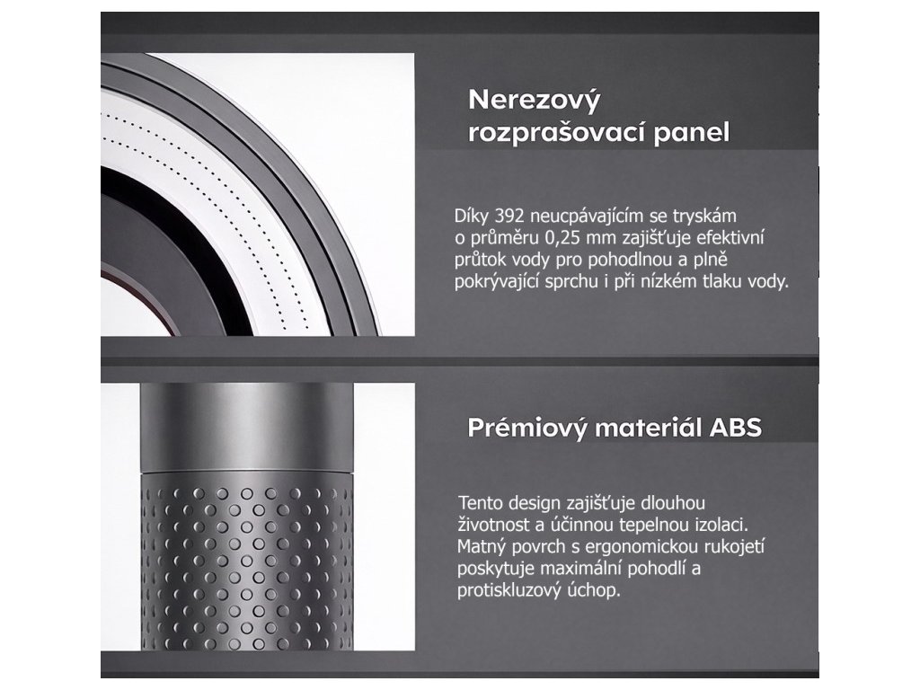 Luxusní sprchová hlavice s nerezovým panelem a hustou sítí 392 mikrotrysek (0,25 mm) vytváří jemný, rovnoměrný a přitom účinný proud vody – pro pocit plného pokrytí i při nižším tlaku.