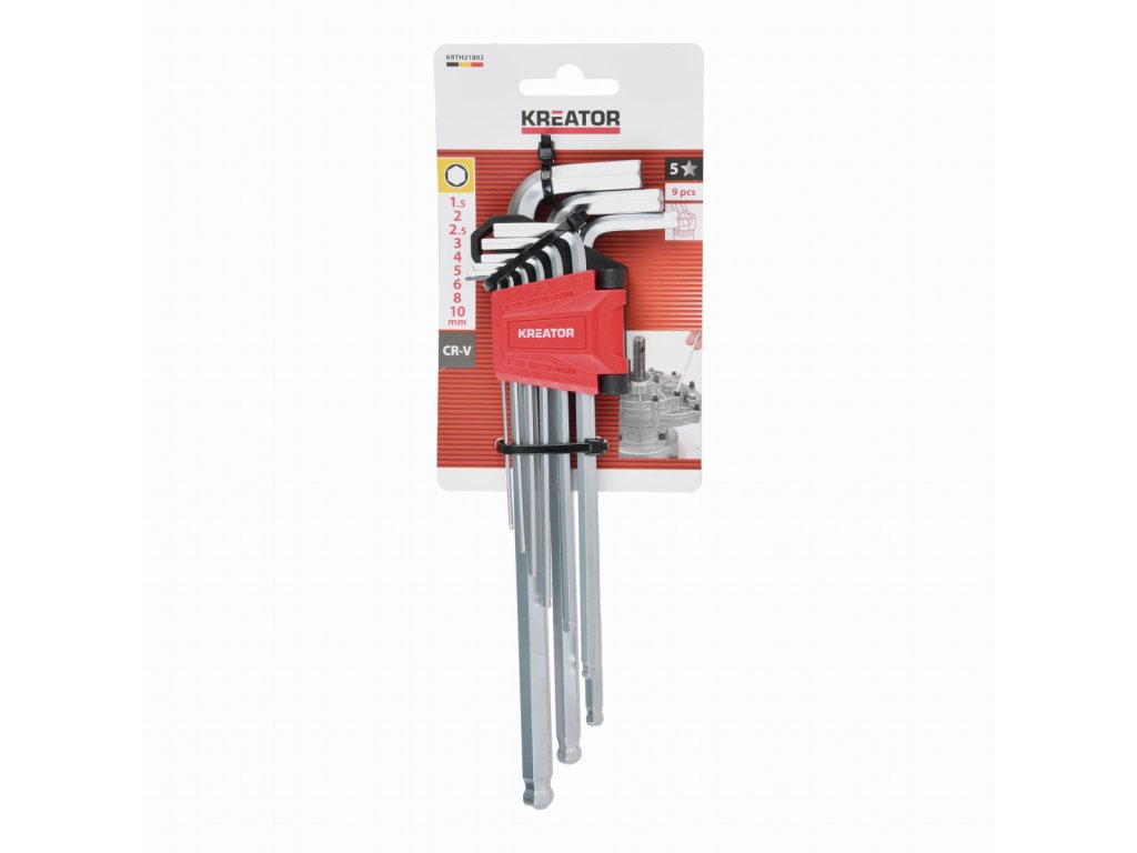 Tato sada KRTH21802 od Kreator obsahuje 9 dlouhých imbusových klíčů ve tvaru L o průměru 1,5 až 10 mm.. Klíče se dodávají v praktickém plastovém boxu pro rychlé a snadné uložení. Na jednom konci jsou klíče ukončeny kuličkou, což znamená, že je můžete použít k zašroubování šroubů pod úhlem.
