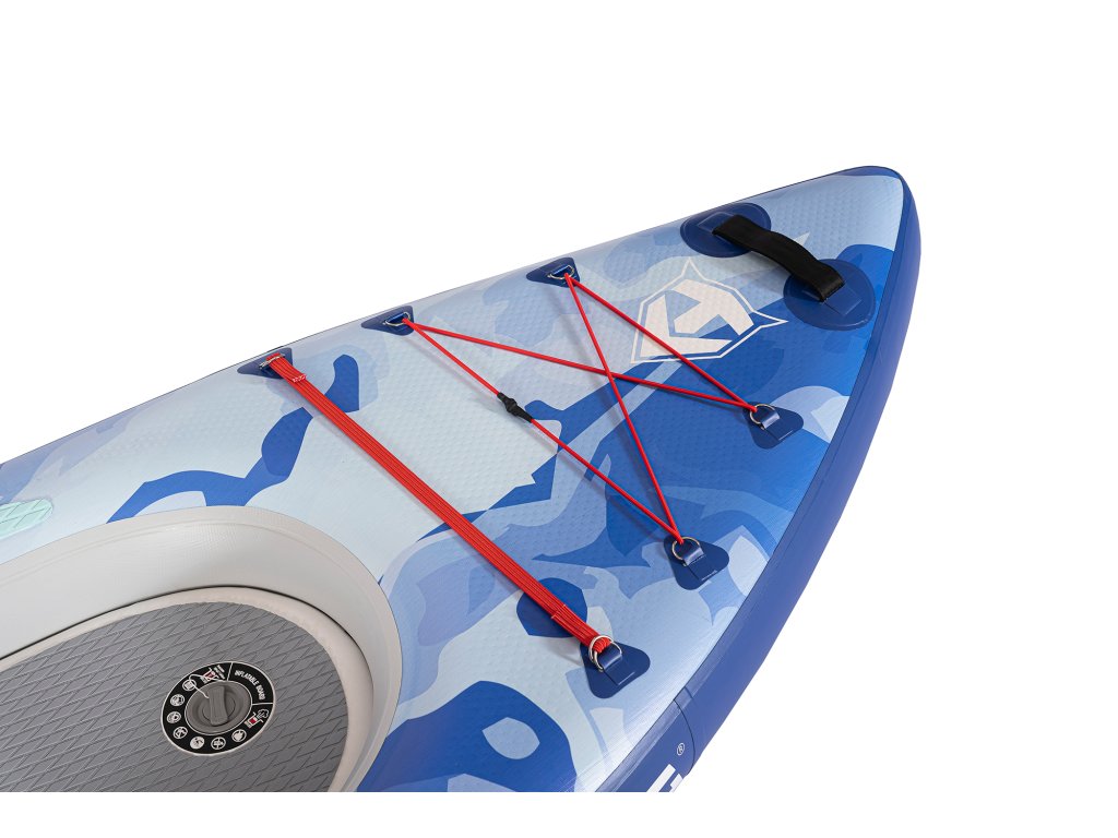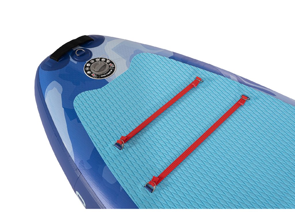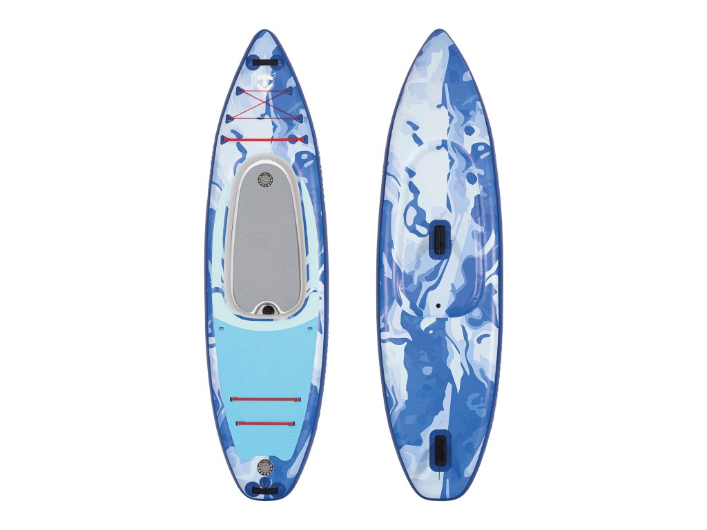 Kajak zaujme výrazným vodním motivem v odstínech modré, který připomíná pohyb vln a dokonale ladí s vodním prostředím. Je vybaven integrovaným sedacím prostorem určeným pro jednoho jezdce. Spodní strana obsahuje dvě ploutve, které zajišťují lepší stabilitu a snadnější ovládání během jízdy.