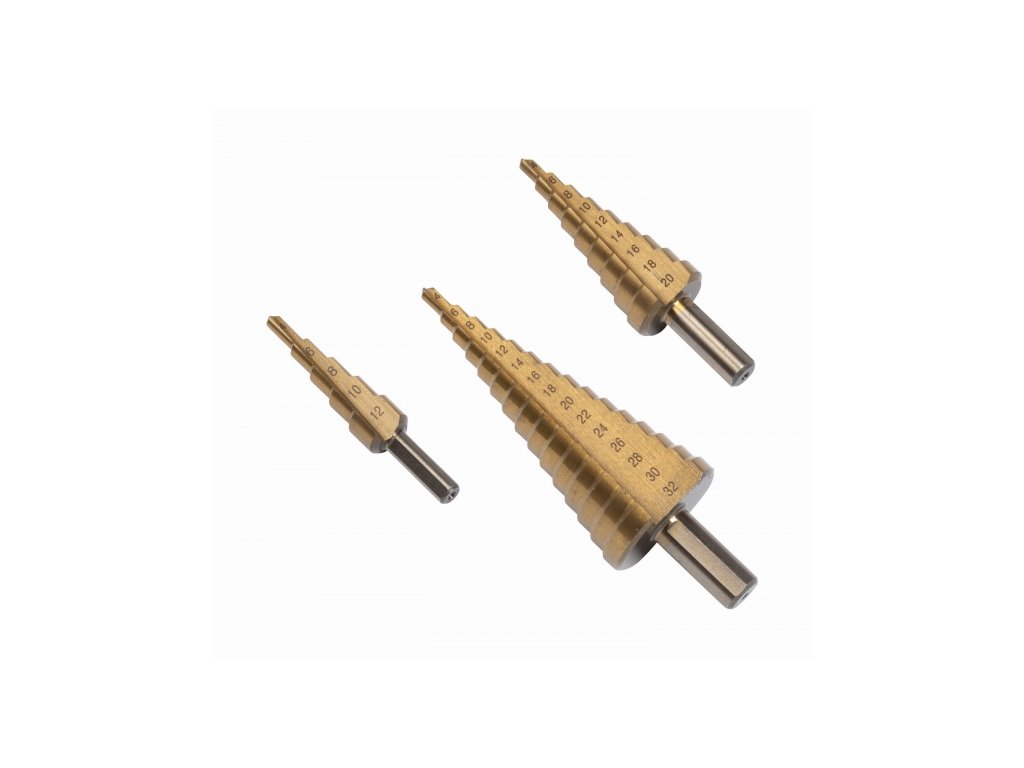 Vrtáky stupňovité TIN 3ks. Vysoce kvalitní vrtací souprava HSS-TIN stupňovitých vrtáků.