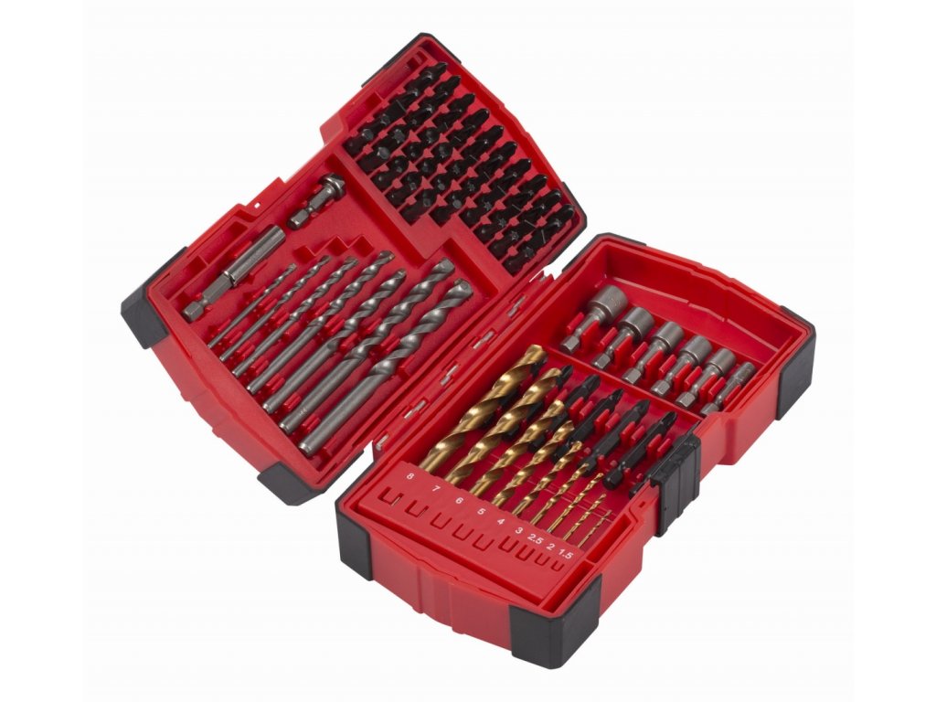 V této 82dílné sadě vrtáků a šroubovacích bitů najdete nepochybně to správné příslušenství pro všechny vaše vrtačky a šroubováky: PH bity, PZ bity, T bity, v různých velikostech, držáky bitů, vrtáky do dřeva a kovu, nástrčné klíče….. Sada je dodávána v praktickém pouzdru s pogumovanými rohy o rozměru 193x113x53 mm.Specifikace: