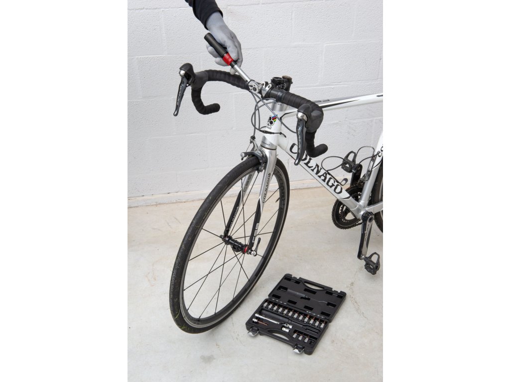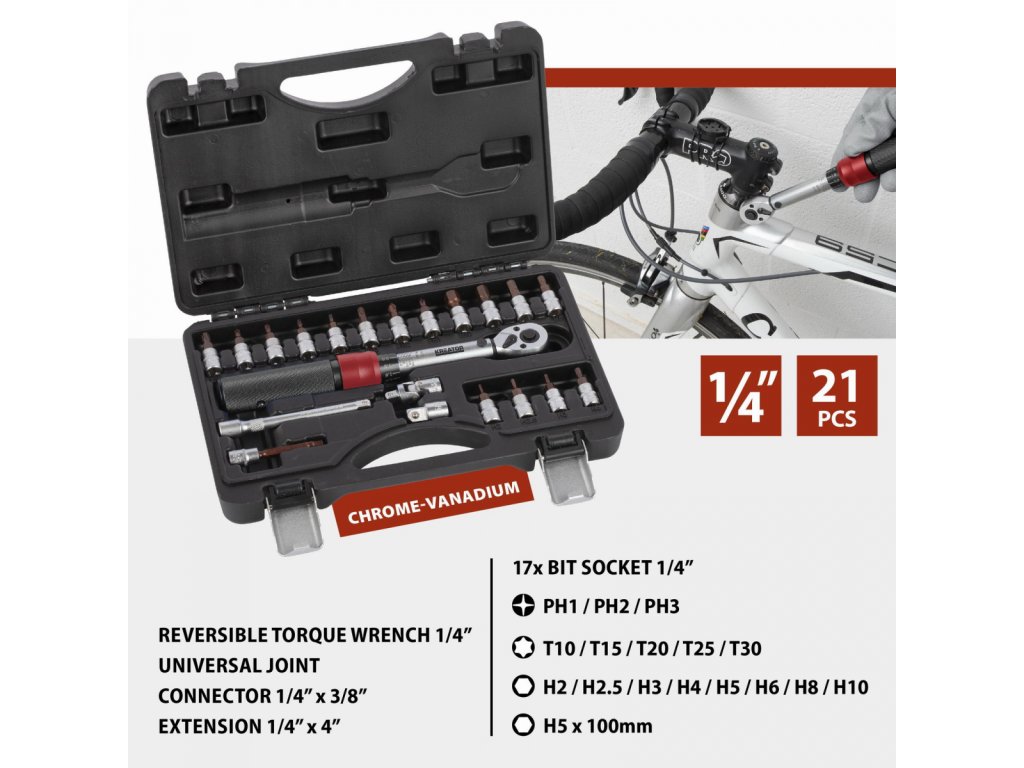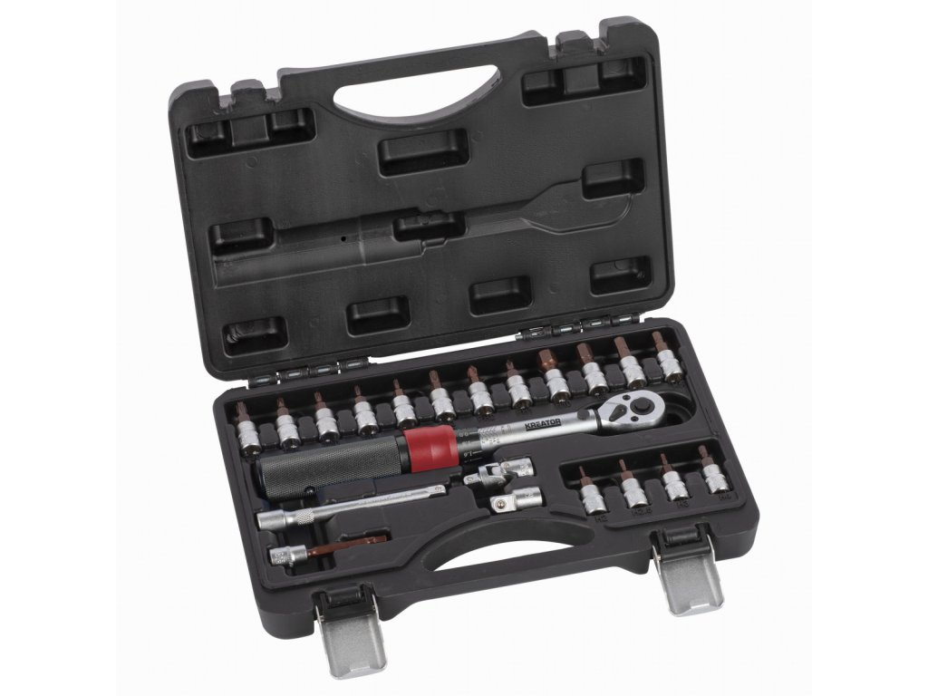 Pokud pracujete s citlivými materiály, je důležité při utahování matic a šroubů použít správnou sílu. Díky této sadě momentových klíčů KRT503101 Kreator můžete pracovat s absolutní přesností. Utahovací moment je snadno nastavitelný (2 – 20 Nm) a cvaknutí, které uslyšíte při utahování, zajišťuje správné utažení matice nebo šroubu. Tento momentový klíč má připojení 1/4 a je ideální pro jemnou práci, např. kola nebo díly motoru. Směr lze také nastavit, takže KRT503101 může utahovat i povolovat matice a šrouby. Hliníková rukojeť činí klíč robustním, ale lehkým pro větší uživatelský komfort. Tato sada je navíc dodávána s 16 bity (T10-T15-T20-T25-T30-H2-H2.5-H3-H4-H5-H6-H8-H10-PH1-PH2-PH3), 100 mm H5 bit, nástavec, univerzální kloub pro úhelníky a adaptér 1/4 na 3/8. Vše, co potřebujete k přesné práci, se dodává v praktickém úložném kufříku, který drží všechny díly pohromadě a zároveň chrání momentový klíč, takže zůstane správně kalibrovaný. Tento momentový klíč je určen pro fandy. Pro profesionální použití se doporučuje klíč nechat zkalibrovat a poté jej nechat každoročně překalibrovat.