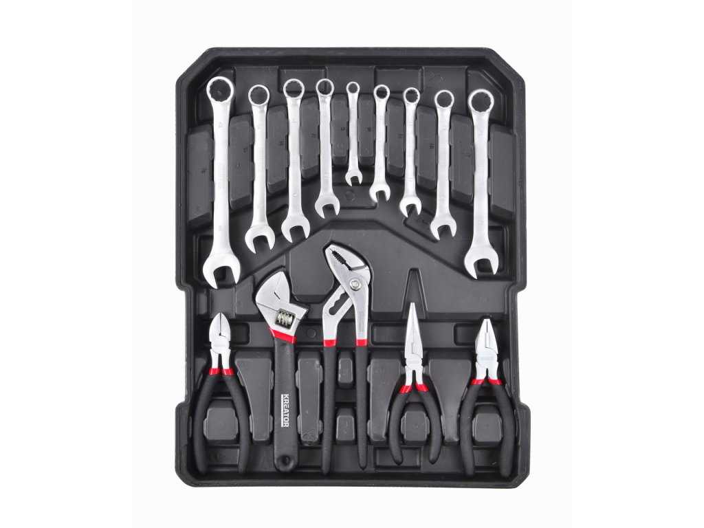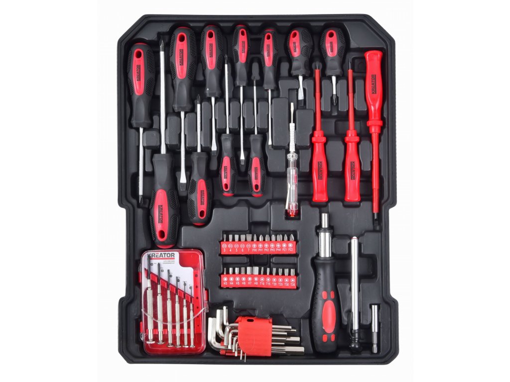 Tato 253-dílná sada nářadí KRT951011 od Kreator má vše, co potřebujete pro každodenní práce a opravy. Řezání, zatloukání, šroubování, vrtání, … Úplný seznam všech prací, které můžete dělat se všemi těmito ručními nástroji, by byl příliš dlouhý. Všechny nástroje a příslušenství jsou po ruce, pěkně schované v praktickém vozíku. Budete schopni rychle najít správný nástroj pro daný úkol. Vozík vám umožní nosit vaše nářadí, ať jste kdekoli.