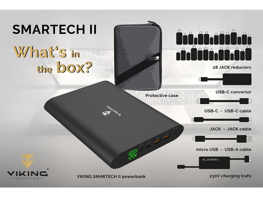Jsme si vědomi, že notebooky mají různé typy nabíjecích konektorů. Proto jsme k naší powerbance Viking SMARTECH II 40000mAh přidali 28 redukcí typu jack a USB-C konvertor, abychom zajistili, že si s sebou můžete vzít svůj notebook kamkoli a kdykoli a nabíjet ho bez omezení. Od teď už nemusíte hledat speciální adaptér - se SMARTECHEM II máte vše, co potřebujete.
