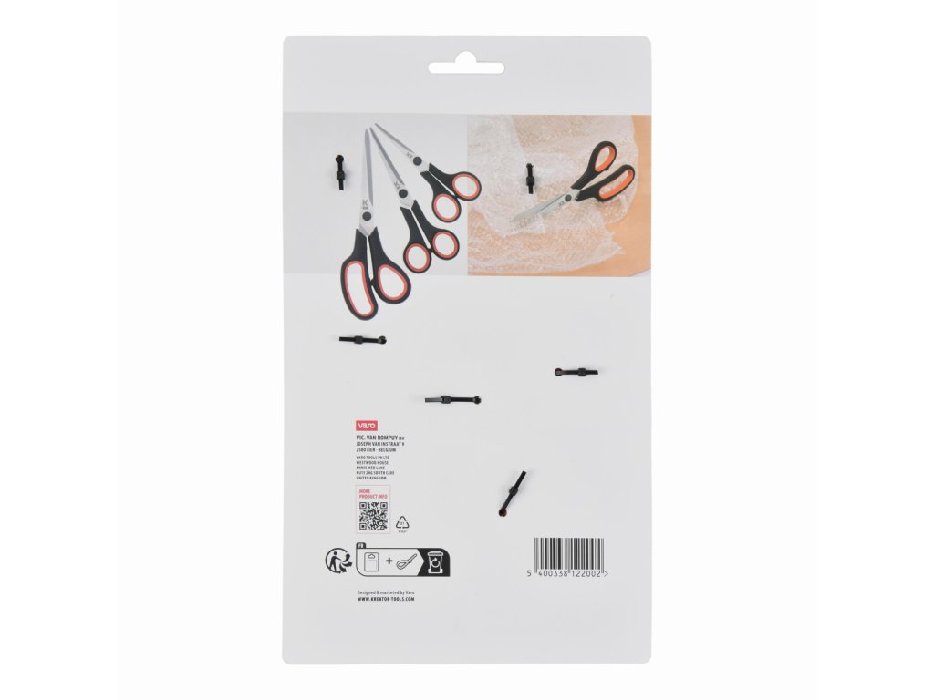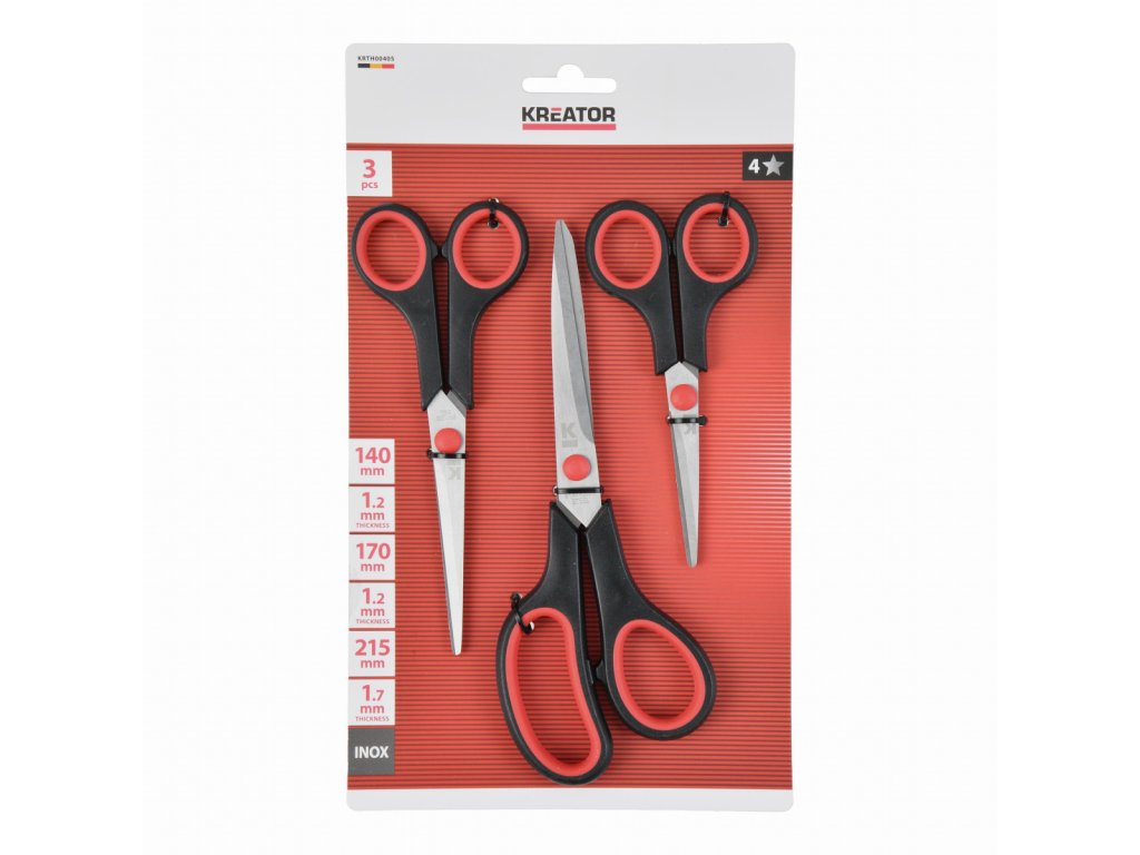 Tato sada KRTH00405 od Kreator se skládá ze 3 kusů nůžek o délce 215, 170 a 140 mm. Jsou vyrobeny z leštěné nerezové oceli a lze je mýt v myčce nádobí. Čepele mají tloušťku 1, 2 a 1,7 mm. Nůžky jsou vybaveny pevnými plastovými rukojeťmi s měkkými vnitřními kroužky pro pohodlný úchop.