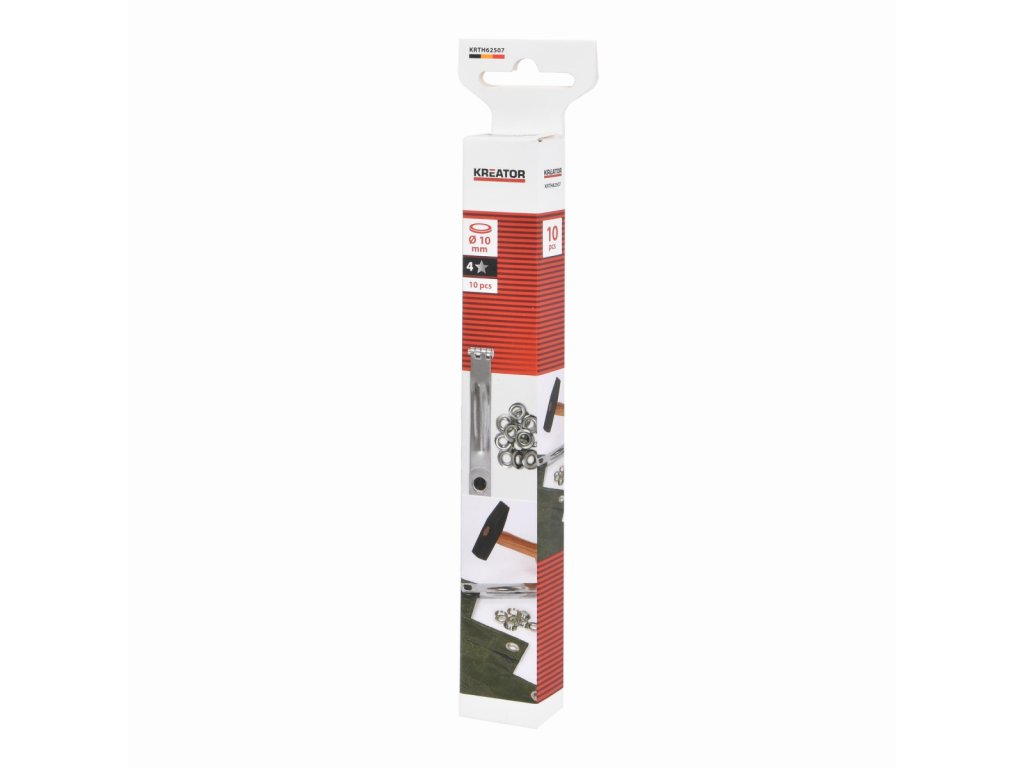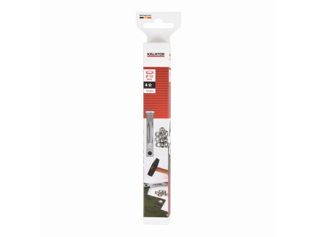 Nýtovací nástroj 10mm plus 10ks. Tento ruční nástroj na průchodky / očka KRTH62507 z naší řady Kreator lze použít k připevnění průchodek s maximálním průměrem 10 mm k plachtám a jiným textiliím. To se provádí pomocí kladiva., Délka - 160 mm, Max. průměr očka - 10 mm, Hmotnost - 0,1 kg...