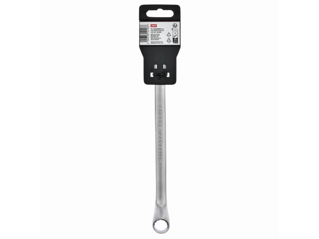 Tento dvojitý očkový klíč KRTH30305 z naší řady Kreator má délku 175 mm a je vyroben z vysoce kvalitní chrom-vanadiového slitiny. Osazené kroužky zajišťují efektivnější přenos vyvíjené síly. Konce mají otvory různých velikostí. Jeden má velikost 14 a druhý 15 mm.