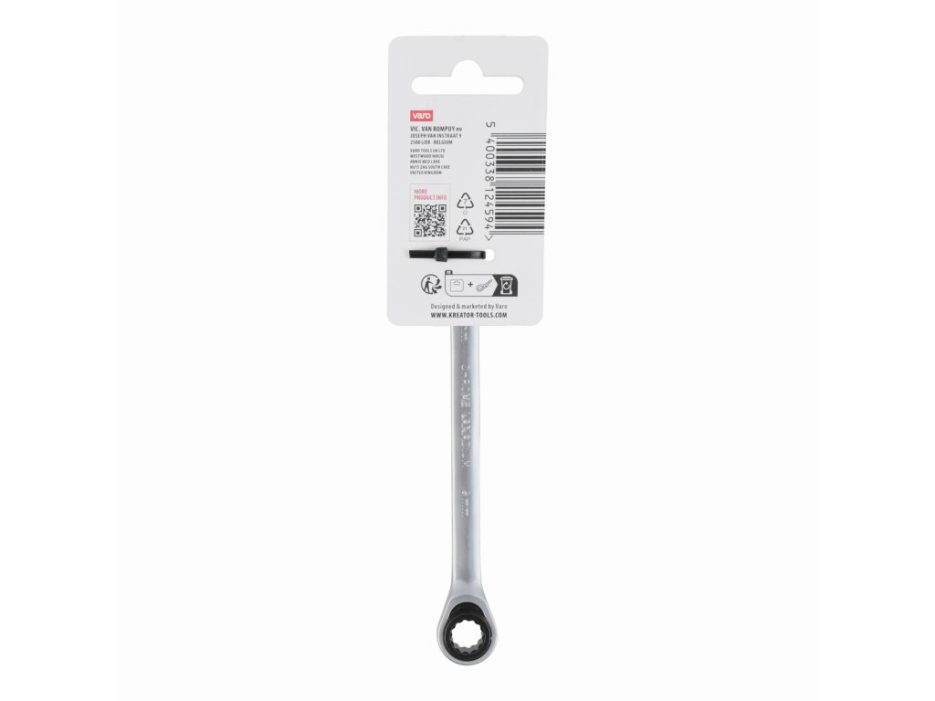 Tento kombinovaný očko ráčna / otevřený klíč KRTH30502 od Kreator je vyroben z vysoce kvalitní chrom-vanadiové slitiny. Délka klíče je 154 mm a má průměr 9 mm. Očko je opatřeno kvalitním strojkem, který má 72 zubů.