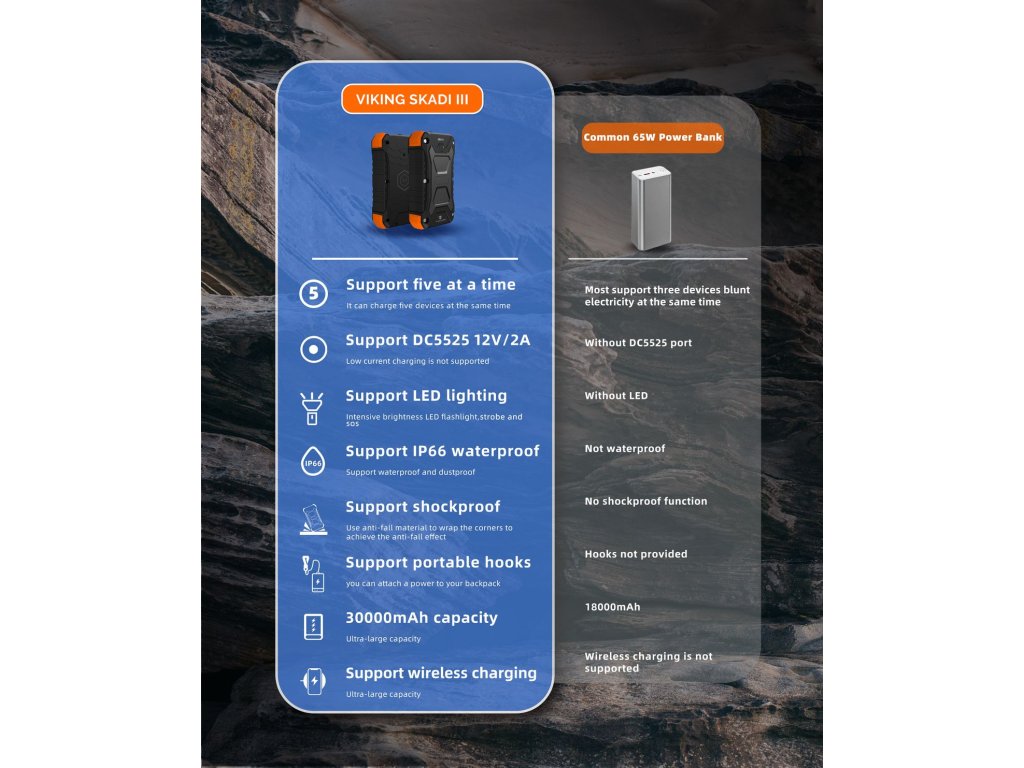 Outdoorová powerbanka Viking SKADI III je vyrobena z odolného materiálu (ABS+PC), který snese náročné podmínky v přírodě. Voděodolné (IP66) a nárazuvzdorné (SHOCKPROOF) provedení znamená, že ji můžete bezpečně používat při turistice, kempování, horolezectví nebo jiných aktivitách.