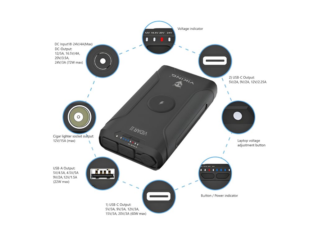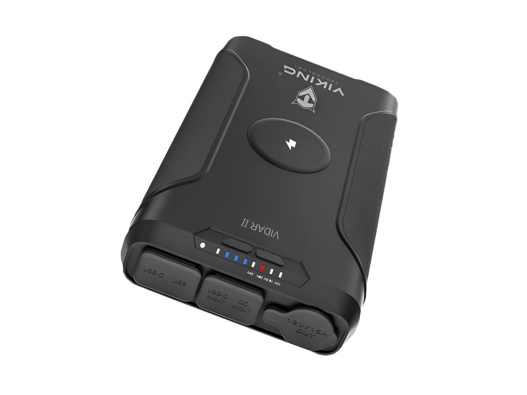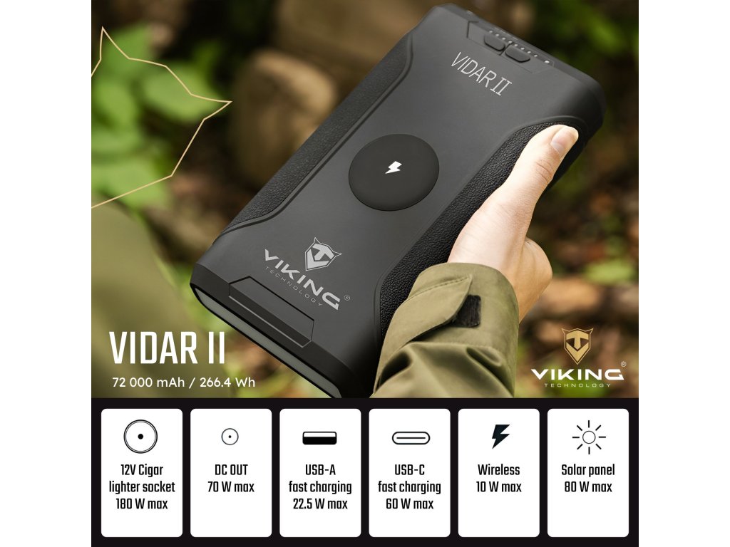 Powerbanka Viking VIDAR II je spolehlivý pomocník pro každého, kdo potřebuje mít energii vždy po ruce – ať už na vícedenním kempování, při práci v terénu nebo na cestách. S kapacitou 72000 mAh, kompaktními rozměry a širokým výběrem výstupů pohodlně nabijete více zařízení současně – od mobilních telefonů přes notebooky až po 12V spotřebiče.