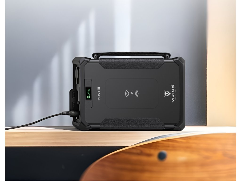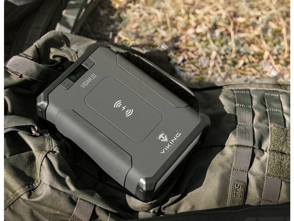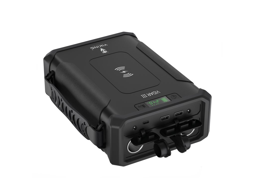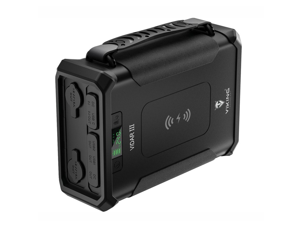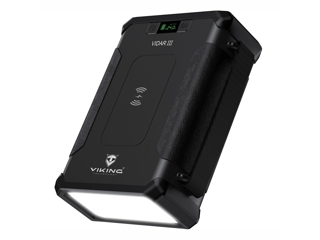 Outdoorová powerbanka Viking VIDAR III • Kapacita: 96000mAh/307.2Wh • Maximální výkon: 180W • Zabudované LED světlo • Široká škála vstupů a výstupů (USB-A, USB-C, Cigaretová zásuvka, DC-jack, WIRELESS Qi) • Možnost solárního napájení • Funkce Pass-Through • Odolnost IP65