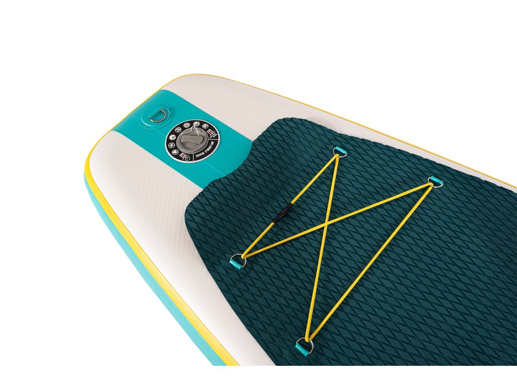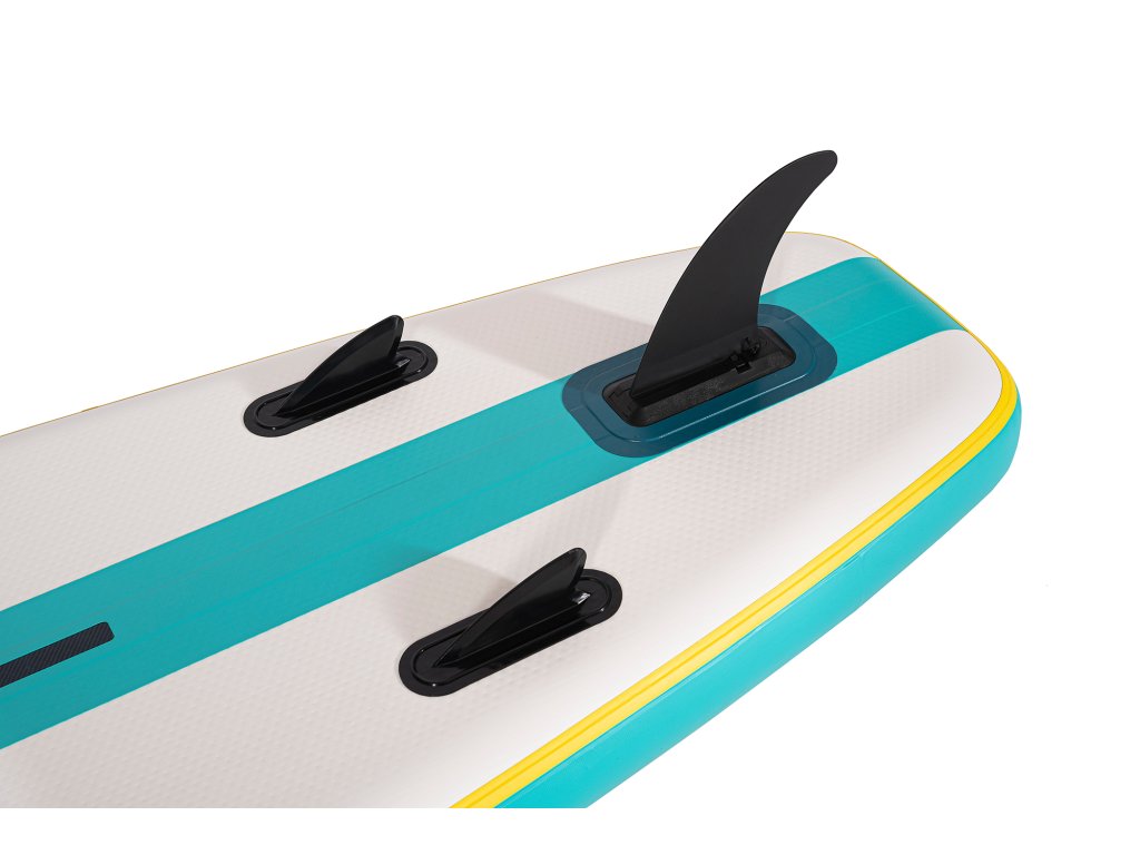 Paddleboard zaujme svěžím designem v kombinaci bílé, modré a žluté, který působí moderně a čistě. Protiskluzová EVA podložka zajišťuje pohodlný a stabilní postoj během jízdy. Spodní strana je elegantně jednoduchá a doplněná třemi ploutvemi, které zvyšují stabilitu a usnadňují ovládání na vodě.