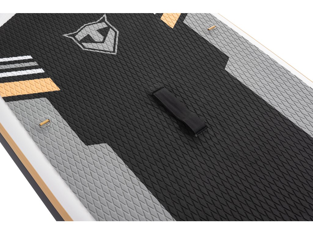 Prémiová konstrukce je založena na dvojvrstvé laminaci DROP-STITCH 2550 g/m2, která zaručuje vysokou pevnost a odolnost. Materiál tvoří čtyřvrstvé PVC v kombinaci s pětivrstvou tkaninou 1000D, která je vyrobena technologií oboustranného křížového spojování. Díky technologii Wire Drawing s karbonovými vlákny má konstrukce vynikající stabilitu, nosnost a dlouhou životnost.