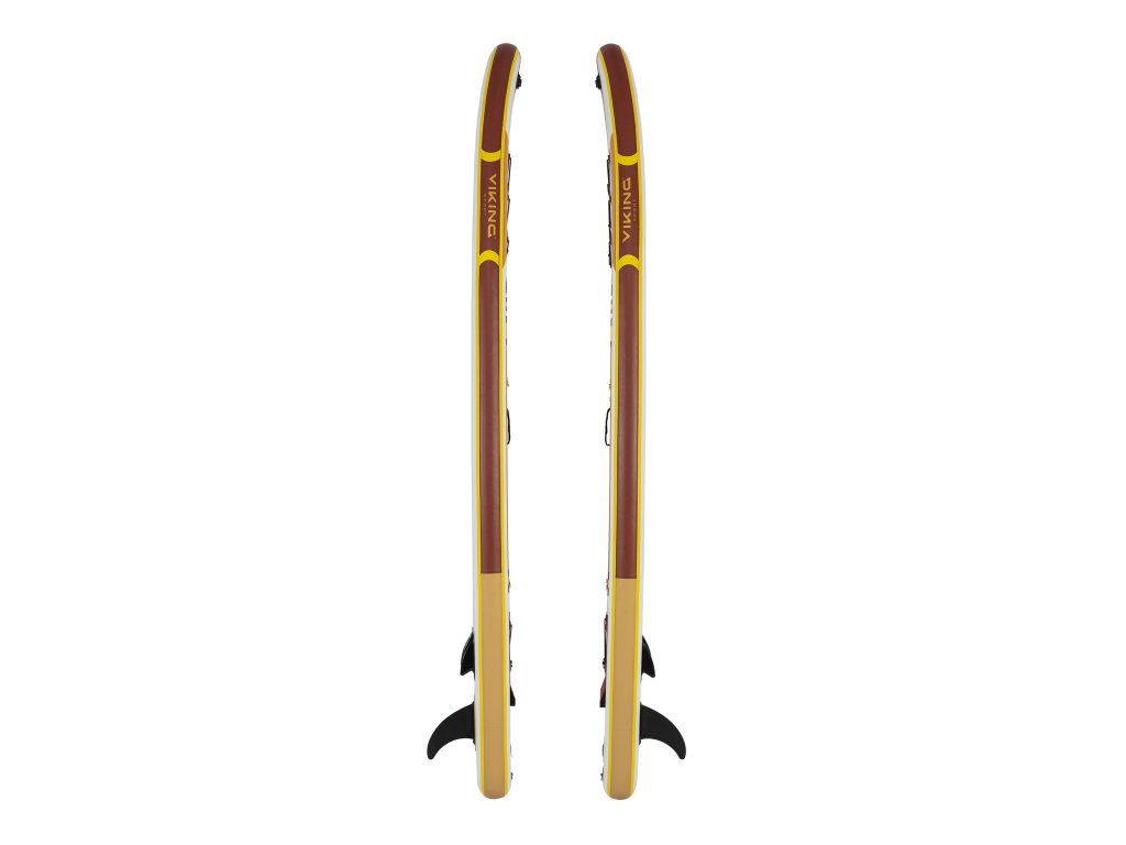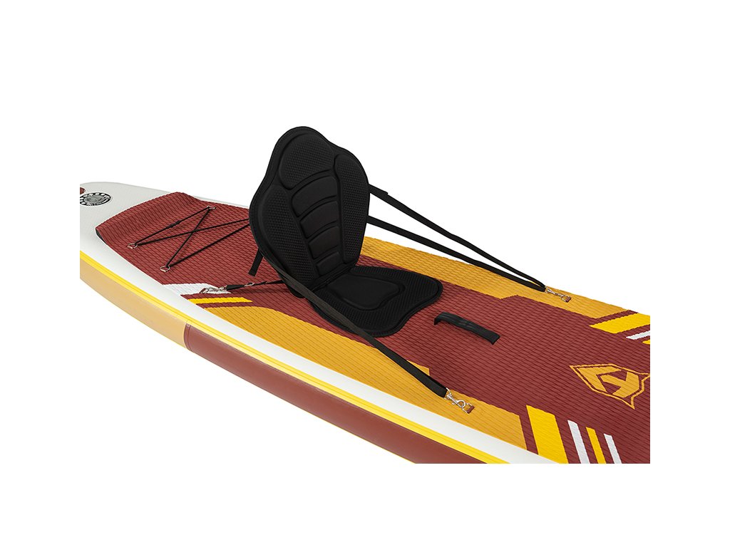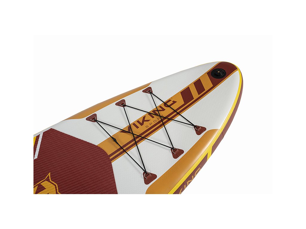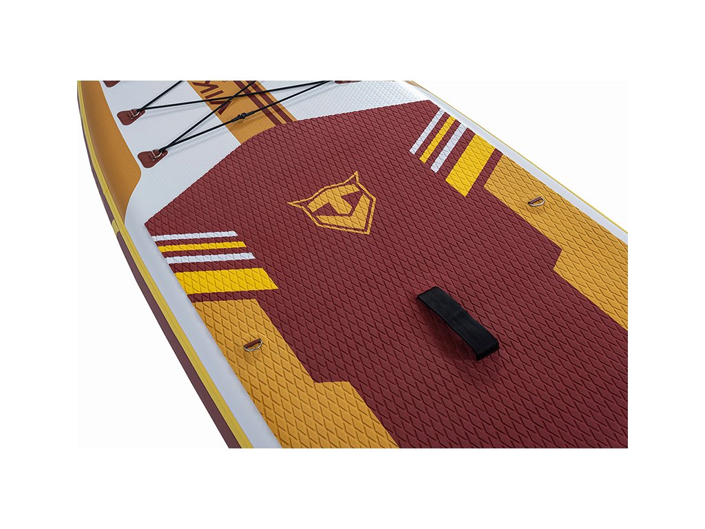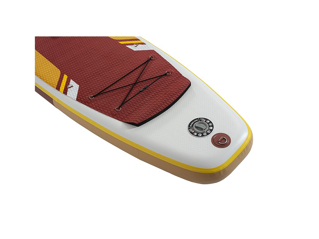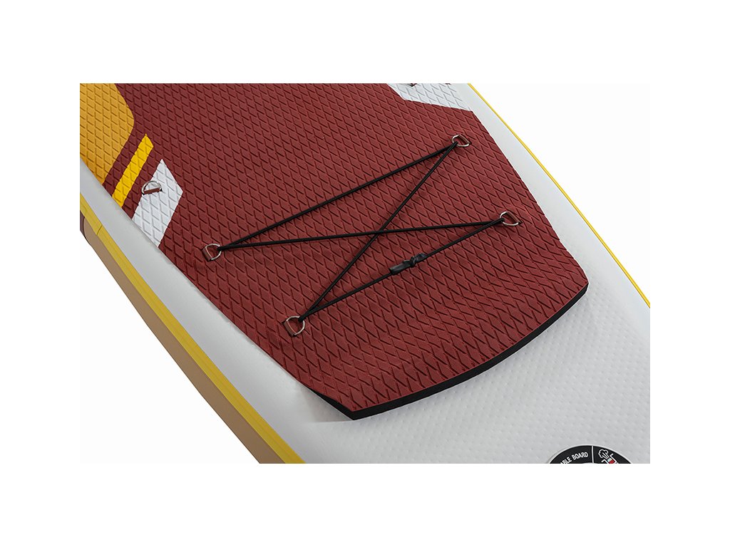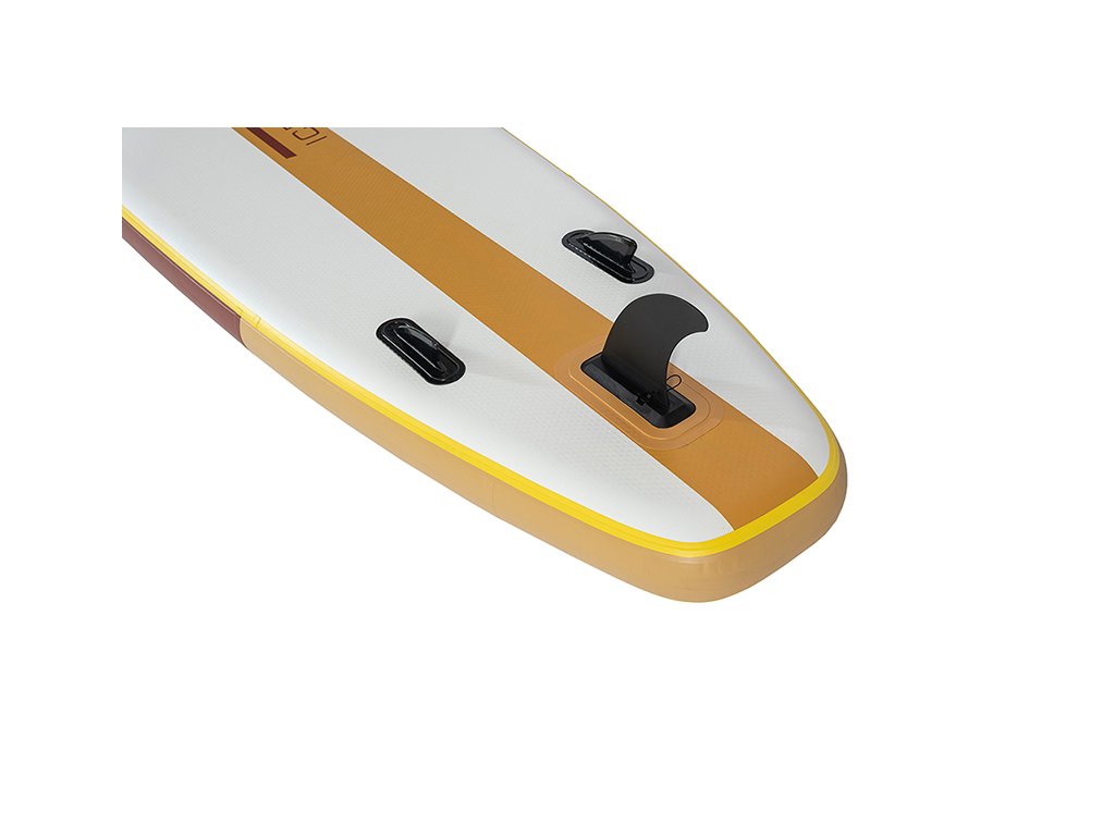 Paddleboard zaujme výrazným designem v kombinaci bílé, hnědé a žluté, který působí moderně a poutavě. Protiskluzová EVA podložka zajišťuje pohodlný a stabilní postoj během jízdy. Spodní strana je elegantně jednoduchá a doplněná třemi ploutvemi, které zvyšují stabilitu a usnadňují ovládání na vodě.