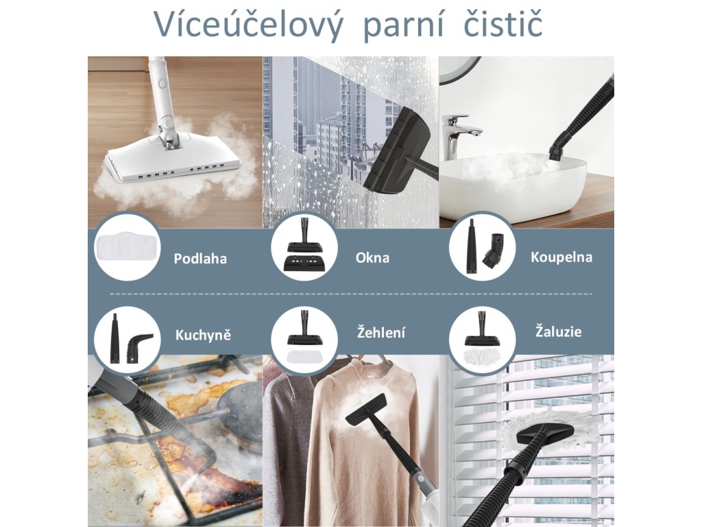 Umožňuje čištění oken, dveří, stěn, kuchyní, koupelen, závěsů, čalounění i dětských hraček