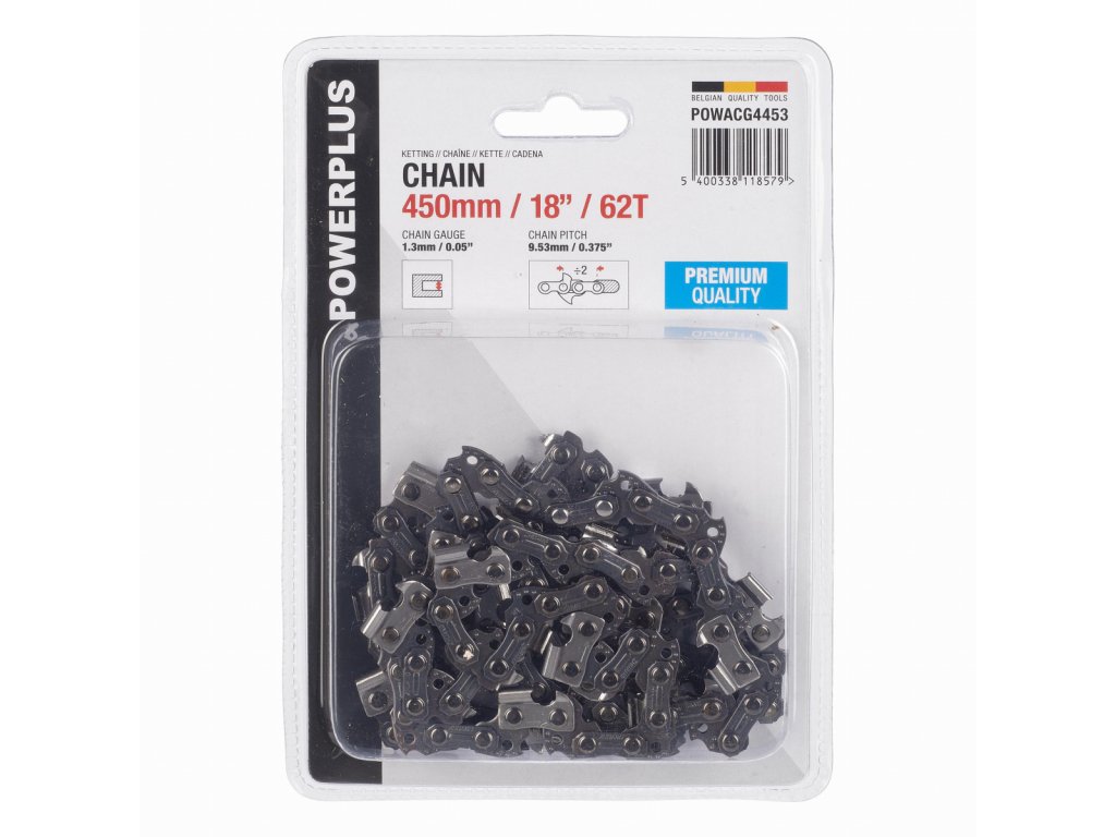 Pilový řetěz 18" (450mm) 62T - PREMIUM. Tento pilový řetěz POWACG4453 od PowerPlus prvotřídní kvality má vylepšenou geometrickou ostrost. Jeho otočné články eliminují tření a zaručují velmi čistý řez. Řetěz je kompatibilní s motorovou pilou Powerplus POWXG10027. Tímto vysoce kvalitním řetězem...