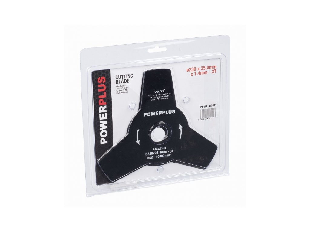 Žací nůž pro křovinořezy 230mm. Tento žací nůž POWERPLUS je určen pro všechny křovinořezy s upínacím průměrem 25,4 mm. kotouč má průměr 230mm a síla materiálu je 1,4mm., Průměr žacího nože - 230 mm, Počet zubů - 3, Upínací otvor - 25,4 mm, Tloušťka - 1,4 mm, Hmotnost - 0,3 kg...