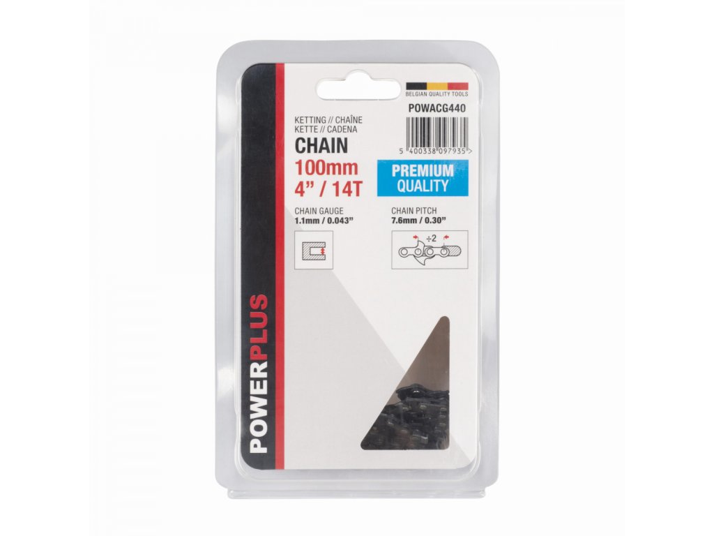 Pilový řetěz 4" (100) - 14T POWERPLUS. Tento pilový řetěz POWACG440 od PowerPlus s označením Premium quality má vylepšenou geometrickou ostrost. Jeho otočné články eliminují tření a zaručují velmi čistý řez. Řetěz je kompatibilní s řetězovými pilami Powerplus POWDPG7572,POWXG1040 a POWXG1045.,...