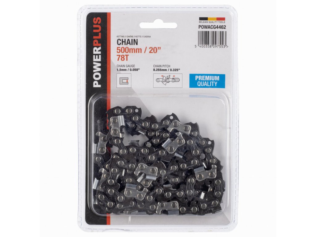 Pilový řetěz 20" (500mm) 78T - PREMIUM. Tento pilový řetěz POWACG4462 od PowerPlus prvotřídní kvality má vylepšenou geometrickou ostrost. Jeho otočné články eliminují tření a zaručují velmi čistý řez. Řetěz je kompatibilní s motorovou pilou Powerplus POWXG10231. Tímto vysoce kvalitním řetězem...