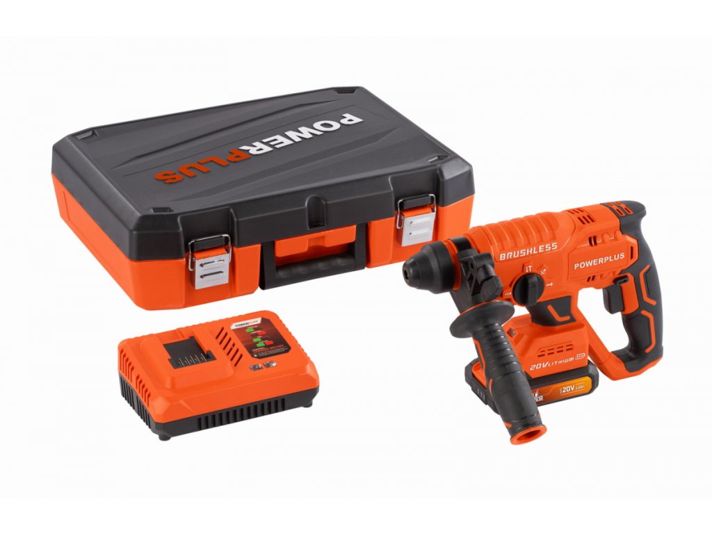 Výhodný SET POWDP15640 Aku kladiva, baterie 20V 2.000mAh Li-Ion, nabíječky a to vše v praktickém kufru.Toto aku kombinované kladivo POWERPLUS POWDP15630 20V můžete použít k vrtání, příklepovému vrtání a sekání do dřeva, kamene, oceli nebo cihel. Díky efektivnímu bezuhlíkovému motoru je nástroj mimořádně odolný a poskytuje mu sílu nárazu 3 J. Lze jej použít pro vrtání do tvrdších materiálů i pro lehčí sekání. Pohodlná práce je zaručena díky nízké úrovni vibrací a měkkému uchopení, které perfektně padne do vaší ruky. Díky praktickému pracovnímu světlu není práce v tmavých prostorách žádný problém a protiprachová krytka chrání před znečištěním vašeho stroje. Zahrnuty jsou tři vrtáky a plochý a špičatý sekáč, takže můžete začít pracovat okamžitě. Použít můžete baterie ze série DUAL POWER o napětí 20V a také i baterie o napětí 40V. Doporučujeme použít 40V baterii, která vám nabízí optimální provozní dobu.