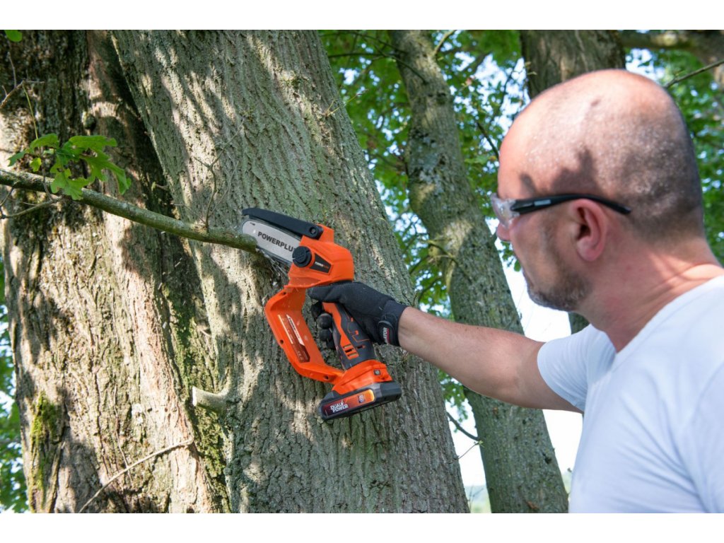 Díky kompaktnímu designu můžete tuto prořezávací Aku pilu 20V POWDPG7572 od PowerPlus ovládat pouze jednou rukou. Nejen, že urychluje práci, ale také poskytuje potřebný pracovní komfort a volnost pohybu. Snadno manévrujte se strojem v úzkých, těžko přístupných oblastech, např. mezi větvemi nebo keři. Takže žádné kabely, které překážejí nebo se nechtěně přeřezávají, také žádné nepříjemné pachy a minimální hluk. Aby byla zaručena vaše bezpečnost, je stroj vybaven dvojitou ochranou proti zpětnému rázu a bezpečnostním krytem. Kromě toho má pila také měkkou rukojeť pro větší pohodlí uživatele. Lišta prémiové kvality je dlouhá 100 mm a je opatřena pevným řetězem se 14 zuby. Při rychlosti řezání 6,7 m/s můžete bez námahy proříznout všechny druhy dřeva. Ideální pro prořezávání malých větví a jiné jemné řezání. Pila je dodávána s ochranným krytem řetězu a lišty, šestihranným klíčem pro nastavení napnutí řetězu a také prázdnou 20ml lahvičkou na olej. Součástí není baterie ani nabíječka baterií, lze dokoupit. Použít můžete baterie ze série DUAL POWER o napětí 20V a také i baterie o napětí 40V. Použití 40V baterie zajišťuje ještě delší dobu chodu stroje ve srovnání s 20V verzí.