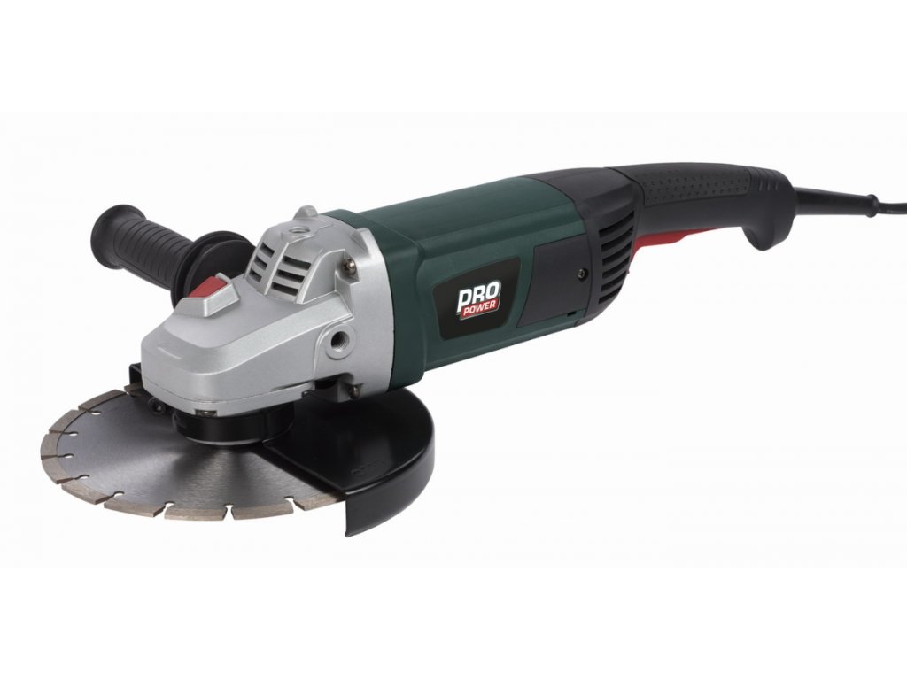 ŘADA PRO POWER JE NAVRŽENA TAK, ABY SPLNILA NÁROČNÉ POŽADAVKY PROFESIONÁLŮ. VYSOCE KVALITNÍ STROJE POSKYTUJÍ VYSOKÝ VÝKON A ZVLÁDNOU I TY NEJNÁROČNĚJŠÍ ÚKOLY. S PRO POWER SI MŮŽETE BÝT JISTI KVALITOU A SPOLEHLIVOSTÍ. Tato kompaktní a výkonná 2 300 W úhlová bruska je určena pro velké kotouče o průměru 230 mm pro odřezávání, broušení, leštění, odstraňování otřepů apod. Aretace vřetena umožňuje snadnou a rychlou výměnu kotouče. Díky pomalému startu motor dosahuje plné rychlosti pozvolna. To zajišťuje optimální kontrolu a bezpečnost práce. Přídavnou měkčenou rukojeť lze nastavit ve třech pozicích. To vám umožní perfektní práci s bruskou. Ochranný kryt kotouče zajišťuje bezpečnou práci.