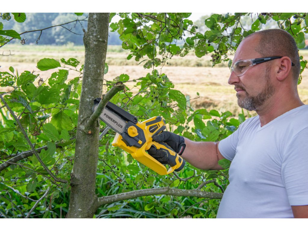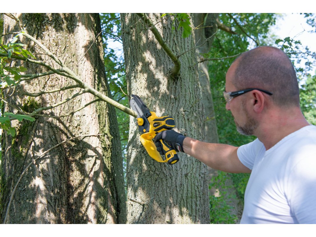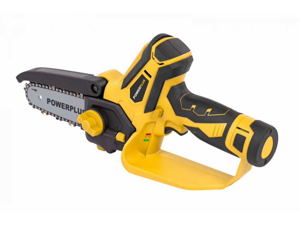 Díky kompaktnímu designu můžete tuto prořezávací Aku 12V pilu POWXG1045 od PowerPlus ovládat pouze jednou rukou. Nejen, že to urychluje práci, ale také poskytuje potřebný pracovní komfort a volnost pohybu. Žádné kabely, které překážejí nebo se nechtěně přeřezávají, také žádné nepříjemné pachy a minimální hluk. Snadno manévrujte se strojem v úzkých, těžko přístupných oblastech, např. mezi větvemi nebo keři. Aby byla zaručena vaše bezpečnost, je stroj vybaven dvojitou ochranou proti zpětnému rázu a bezpečnostním krytem. Navíc neztrácíte čas nastavováním napnutí řetězu, protože to můžete provést bez nářadí díky systému napínání řetězu typu SDS. Pro větší uživatelský komfort má pila také měkčenou rukojeť. Lišta prémiové kvality je dlouhá 100 mm a je opatřena pevným řetězem se 14 zuby. Při rychlosti řezání 6,7 m/s můžete bez námahy proříznout všechny druhy dřeva. Ideální pro prořezávání malých větví a jiné jemné řezání. Pila je dodávána s extra 12V baterií a nabíječkou, takže druhou baterii můžete nabíjet během řezání a jednoduše pokračovat v práci. V neposlední řadě je součástí pily i ochranný kryt řetězu a lišty a také prázdná 20ml lahvička na olej.