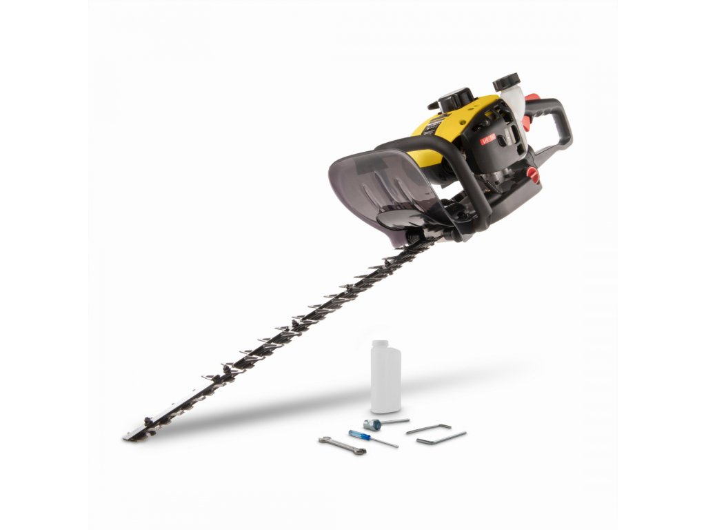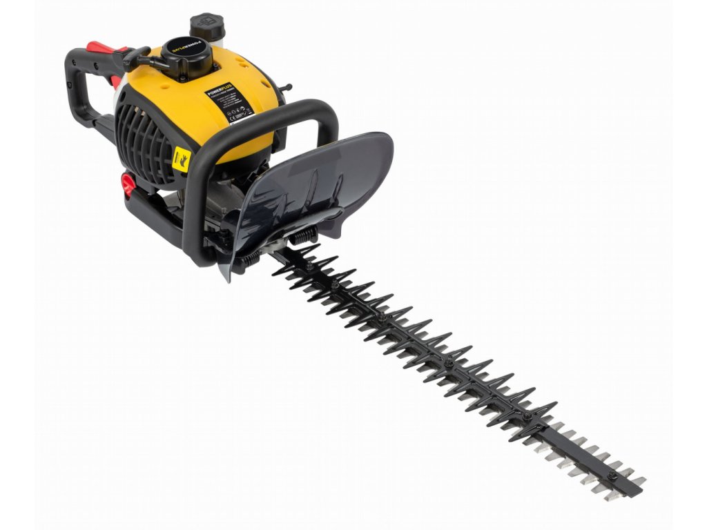 Tyto nůžky na živý plot POWXG2018 od PowerPlus jsou vybaveny motorem o objemu 25,4 cm3. Takže máte dostatek síly pro rychlé stříhání živých plotů a keřů s atraktivním výsledkem. S velikostí čepele 600 mm a laserem řezanými dvojčinnými čepelemi si snadno poradíte i s větvemi o průměru až 28 mm. Nastavitelný úhel zastřihování (otočná rukojeť) umožňuje sledovat tvar keře nebo živého plotu, aniž byste se museli natahovat a ohýbat v nevhodných polohách. Motor s nádrží o objemu 0,53 l poskytuje naprostou volnost pohybu. Ochranný štít a systém redukce vibrací zaručují vaši bezpečnost a snadný start motoru vám umožní rychle se pustit do práce. Rychlé zastavení je také velmi užitečným bezpečnostním prvkem, který po vaší činnosti okamžitě zastaví nože.