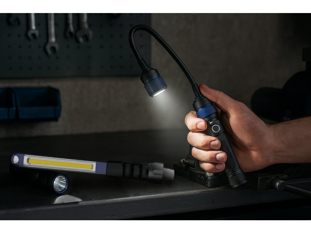 - Ohebná hlavice s možností natočení a přizpůsobení směru světla vám umožní nasvítit i hůře dostupná místa. S maximálním výkonem 190 lumenů je skvělým pomocníkem v dílně i při technických úpravách.