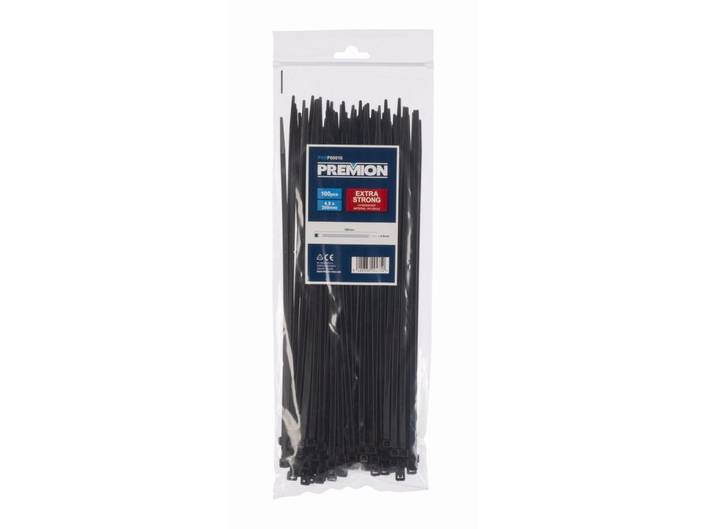 Tato sada PREP00010 od Premion obsahuje 100 ks černých nylonových stahovacích pásek 4,8 x 300 mm. Tyto extra pevné stahovací pásky mají vysokou pevnost v tahu. Použijte je k úhlednému svázání kabelů nebo ke snadnému vzájemnému spojení předmětů. Úhledně ukryjte kabely a vodiče například ve své kanceláři nebo dílně tím, že je svážete pomocí těchto kabelových stahovacích pásků. Navíc jsou tyto stahovací pásky odolné vůči UV záření.