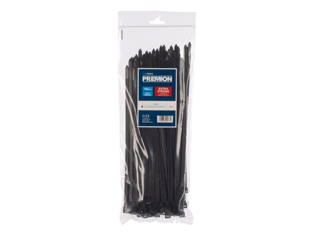 Tato sada PREP00012 od Premion obsahuje 100 ks černých nylonových stahovacích pásek 7,6 x 300 mm. Tyto extra pevné stahovací pásky mají vysokou pevnost v tahu. Použijte je k úhlednému svázání kabelů nebo ke snadnému vzájemnému spojení předmětů. Úhledně ukryjte kabely a vodiče například ve své kanceláři nebo dílně tím, že je svážete pomocí těchto kabelových stahovacích pásků. Navíc jsou tyto stahovací pásky odolné vůči UV záření.