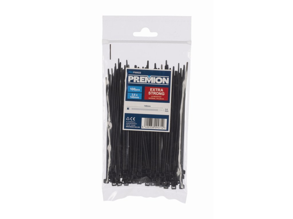 Tato sada PREP00022 od Premion obsahuje 100 ks černých nylonových stahovacích pásek 3,6 x 140 mm. Tyto extra pevné stahovací pásky mají vysokou pevnost v tahu. Použijte je k úhlednému svázání kabelů nebo ke snadnému vzájemnému spojení předmětů. Úhledně ukryjte kabely a vodiče například ve své kanceláři nebo dílně tím, že je svážete pomocí těchto kabelových stahovacích pásků. Navíc jsou tyto stahovací pásky odolné vůči UV záření.
