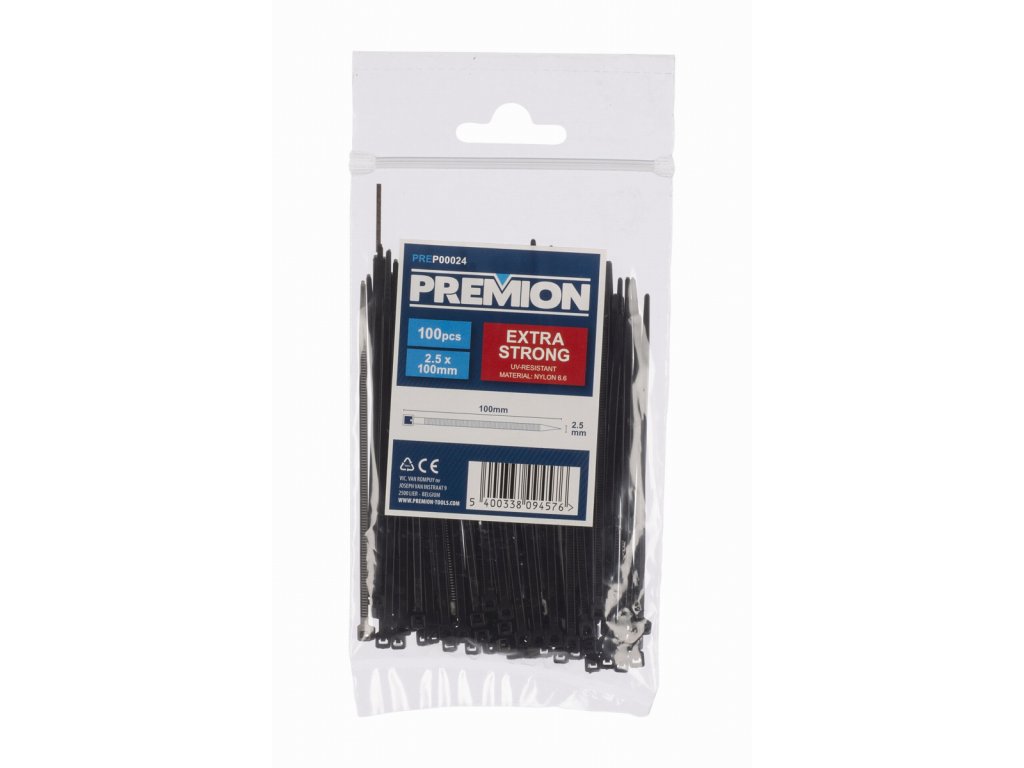 Tato sada PREP00024 od Premion obsahuje 100 ks černých nylonových stahovacích pásek 2,5 x 100 mm. Tyto extra pevné stahovací pásky mají vysokou pevnost v tahu. Použijte je k úhlednému svázání kabelů nebo ke snadnému vzájemnému spojení předmětů. Úhledně ukryjte kabely a vodiče například ve své kanceláři nebo dílně tím, že je svážete pomocí těchto kabelových stahovacích pásků. Navíc jsou tyto stahovací pásky odolné vůči UV záření.