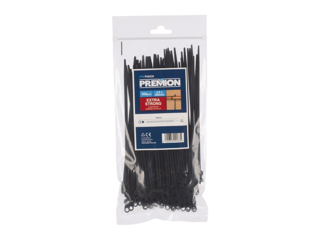 Tato sada PREP00030 od Premion obsahuje 100 ks černých nylonových stahovacích pásek 4,8 x 200 mm s otvorem. Tyto extra pevné stahovací pásky mají vysokou pevnost v tahu. Použijte je k úhlednému svázání kabelů nebo ke snadnému vzájemnému spojení předmětů. Úhledně ukryjte kabely a vodiče například ve své kanceláři nebo dílně tím, že je svážete pomocí těchto kabelových stahovacích pásků. Navíc jsou tyto stahovací pásky odolné vůči UV záření.
