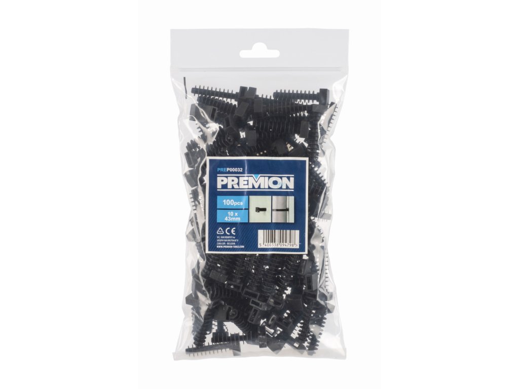 Tato sada PREP00032 od Premion obsahuje 100 ks hmoždinek pro uchycení stahovací pásky v černé barvě. Vhodné pro pásky do šířky 10mm. Délka hmoždinky je 43mm.