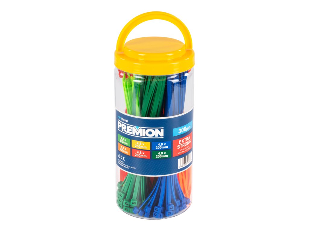 Tato sada PREP00034 od Premion obsahuje 300 ks nylonových stahovacích pásek 4,8 x 200 mm v různých barvách a to v červené, žluté, zelené, světle zelené, oranžové a modré. Tyto extra pevné stahovací pásky mají vysokou pevnost v tahu. Použijte je k úhlednému svázání kabelů nebo ke snadnému vzájemnému spojení předmětů. Úhledně ukryjte kabely a vodiče například ve své kanceláři nebo dílně tím, že je svážete pomocí těchto kabelových stahovacích pásků. Navíc jsou tyto stahovací pásky odolné vůči UV záření. Navíc jsou uloženy v praktickém obalu.