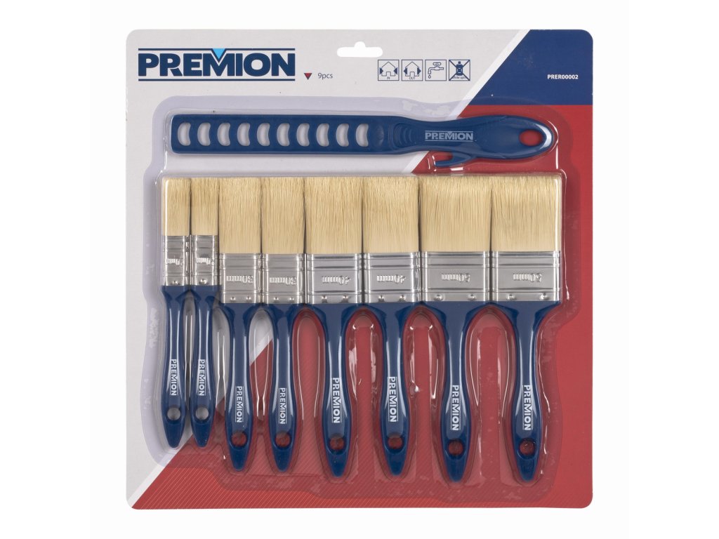 Sada plochých štětců 9ks. Použijte tuto 9dílnou sadu štětců Premion PRER00002 k malování uvnitř i venku. Rukojeti jsou pohodlně opatřeny závěsným okem pro snadné skladování. Pro detailní práci můžete použít 2 úzké 20 mm štětce. Kromě toho sada obsahuje také 2 štětce 30 a 40 mm, 2 široké 50 mm...