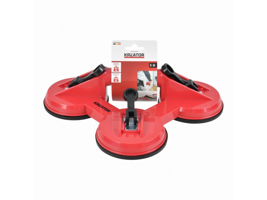 Tuto tříbodovou přísavku KRTH50403 od Kreator lze použít k pevnému uchycení na dlaždicích, zrcadlech, oknech nebo jiných kluzkých předmětech, které se obtížně přenášejí. Rychloupínací páčky zajišťují bezpečné uchycení přísavky a také její snadné sejmutí bez zanechání stop. Přísavka o průměru 115 mm unese až 90 kg svisle a 100 kg vodorovně.