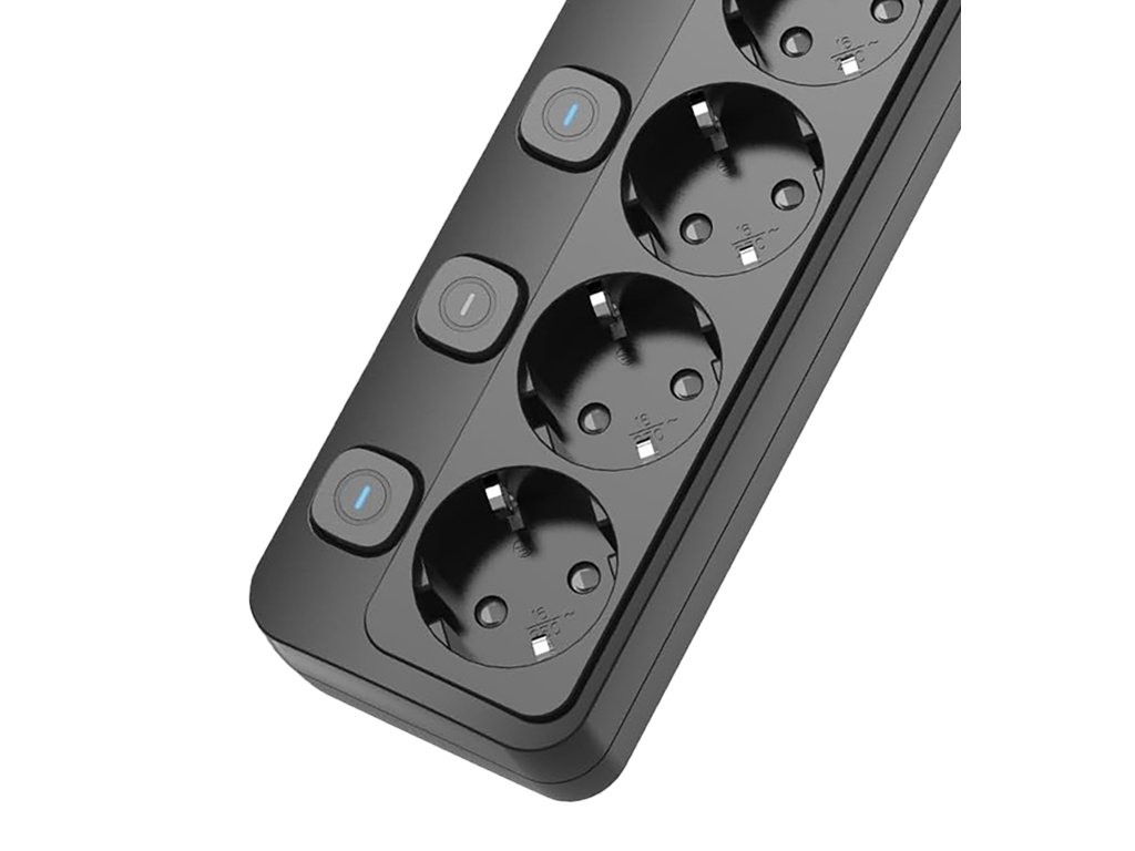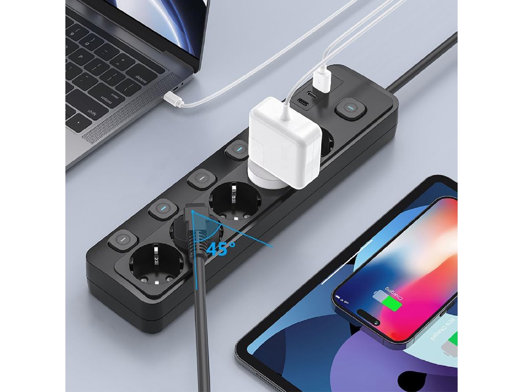 Prodlužovací zásuvka • rozbočovač • 5 x AC výstup (230V, 16A) • 1 x USB-A výstup 18W(5V/3A, 9V/2A, 12V/1,5A) • 2 x USB-C výstup 20W(5V/3A, 9V/2,22A, 12V/1,67A) • hlavní tlačítko ON/OFF • kompaktní rozměry a design • délka kabelu 1,5 m • individuální zapnutí/vypnutí každého AC výstupu • možnost nabíjení až 8 zařízení současně