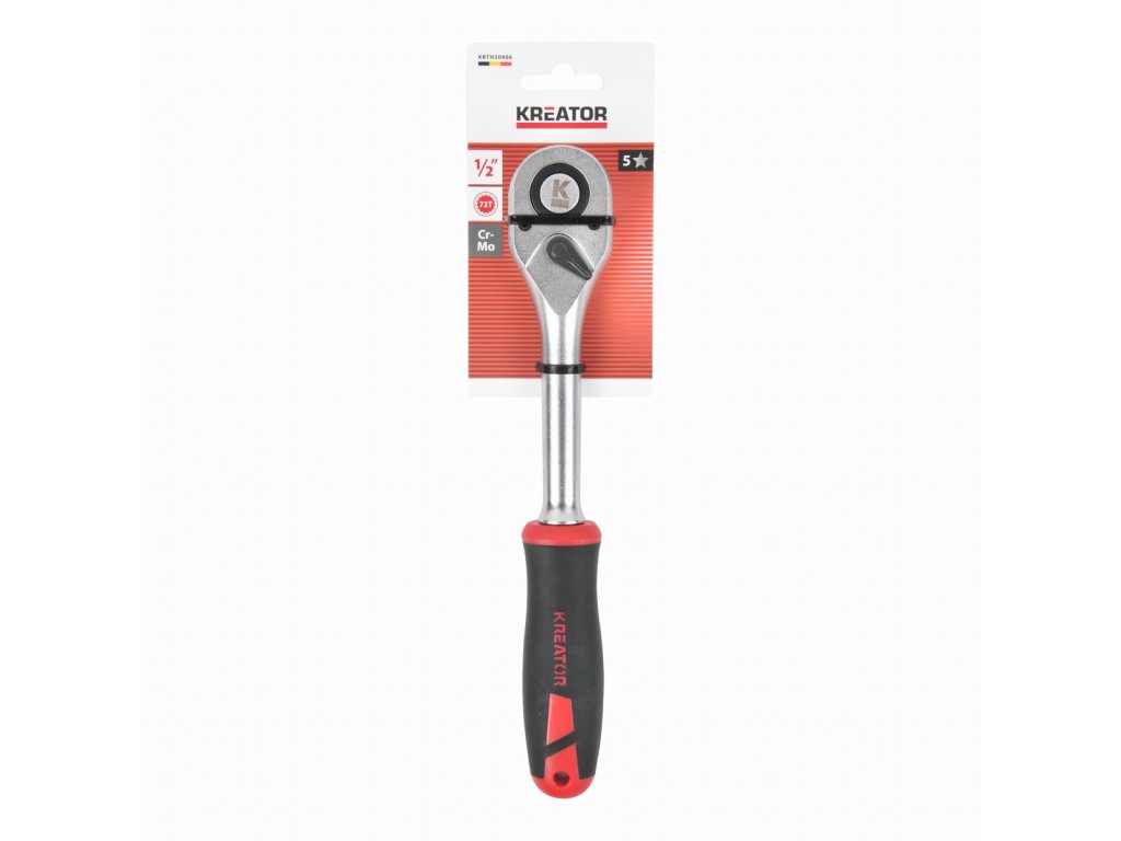 Ráčna 1/2" 72T. Tato ráčna s upínáním 1/2" KRTH30906 z naší řady Kreator je vyrobena z robustní chrom-molybdenové slitiny. Ráčna má měkkou, protiskluzovou gumovou rukojeť a je užitečná při povolování nebo utahování šroubů, např. při výměně pneumatik automobilu. K uvolnění ořechů použijte...