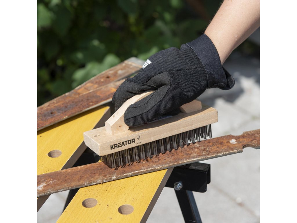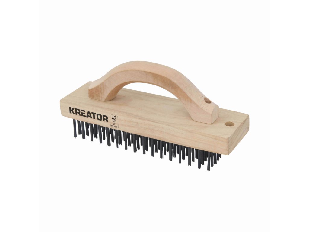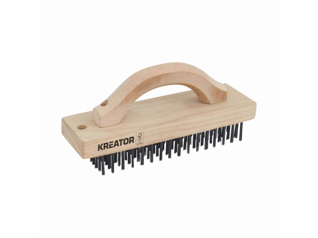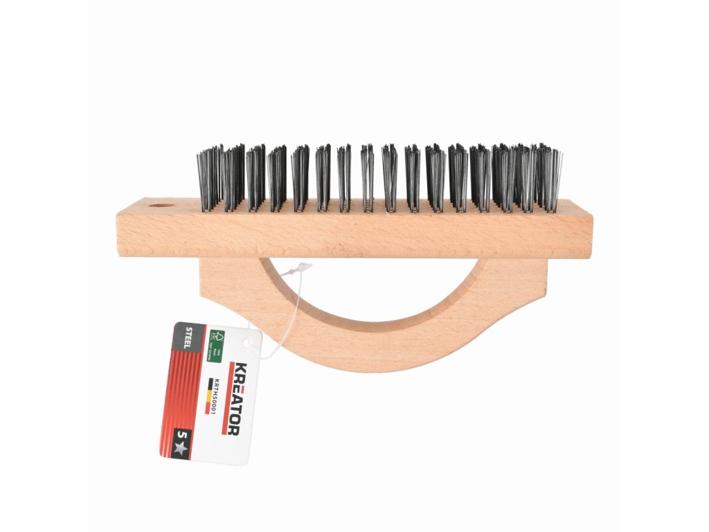 Tento dřevěný drátěný kartáč KRTH50001 z naší řady Kreator má 96 řad ocelových štětin pro odstranění nečistot a rzi z kovu. Po použití můžete kartáč zavěsit pomocí praktického závěsného očka na rukojeti. Protiskluzová rukojeť zajišťuje pevný úchop a je jako tělo vyrobeno ze dřeva s certifikací FSC(R).