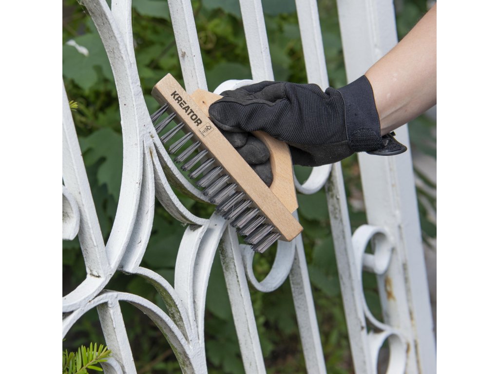 Ruční drátěný ocelový kartáč, dřevěná rukojeť. Tento dřevěný drátěný kartáč KRTH50001 z naší řady Kreator má 96 řad ocelových štětin pro odstranění nečistot a rzi z kovu. Po použití můžete kartáč zavěsit pomocí praktického závěsného očka na rukojeti. Protiskluzová rukojeť zajišťuje pevný úchop a...