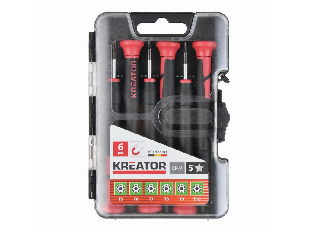 Sada precizních šroubováků TORX - HIGH QUALITY. Tyto přesné šroubováky KRTH22103 od Kreator jsou ideální pro detailní a přesnou práci. Sada obsahuje 6 TORX šroubováků. Měkká protiskluzová rukojeť zajišťuje pevný úchop., Materiál - Chrome vanadium, Hlava - TORX, Rozměr - T5 T6 T7 T8 T9 T10...
